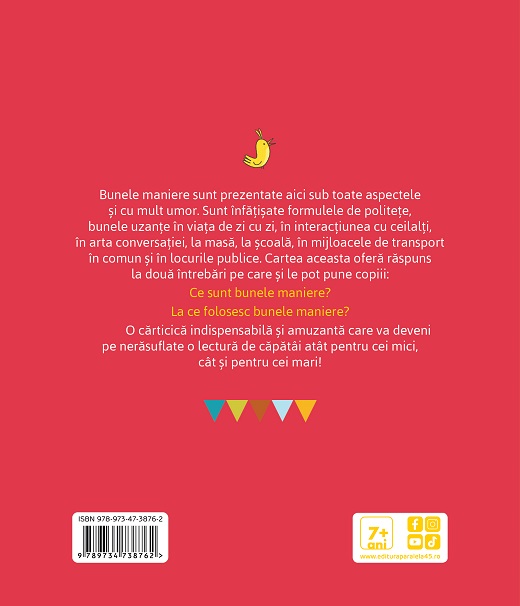 Bunele maniere sunt prezentate aici sub toate aspectele și cu mult umor. Sunt înfățișate formulele de politețe, bunele uzanțe în viața de zi cu zi, în interacțiunea cu ceilalți, în arta conversației, la masă, la școală, în mijloacele de transport în comun și în locurile publice. Cartea aceasta oferă răspuns la două întrebări pe care și le pot pune copiii: