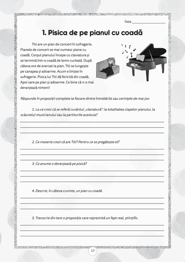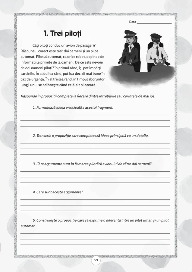 Textele propuse sunt foarte potrivite timpurilor noastre și preferințelor copilului de astăzi: se citesc repede, au elemente surprinzătoare șiantrenante. Sunt texte noi, proaspete, capabile să provoace gândirea, fără a-l obosi sau plictisi pe copil. Întrebările de pe marginea lor se repetă de-a lungul caietului, cu exersarea sistematică a zece mari competențe specific citit-scrisului de nota zece.