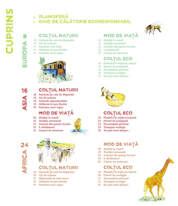 Datorita acestui atlas vei invata sa calatoresti altfel: sa gusti din produsele locale, sa vorbesti cu locuitorii din zonele vizitate, sa locuiesti pur si simplu in mijlocul lor, sa produci cat mai putine deseuri, sa te deplasezi fara sa poluezi... Iata bazele ecoturismului! Datorita ilustratiilor, vei vedea ca fiecare continent are o flora si o fauna proprii, speciale, dar si locuri pentru dormit cu adevarat surprinzatoare. Exploreaza si descopera planeta cu acest exceptional atlas ecologic!