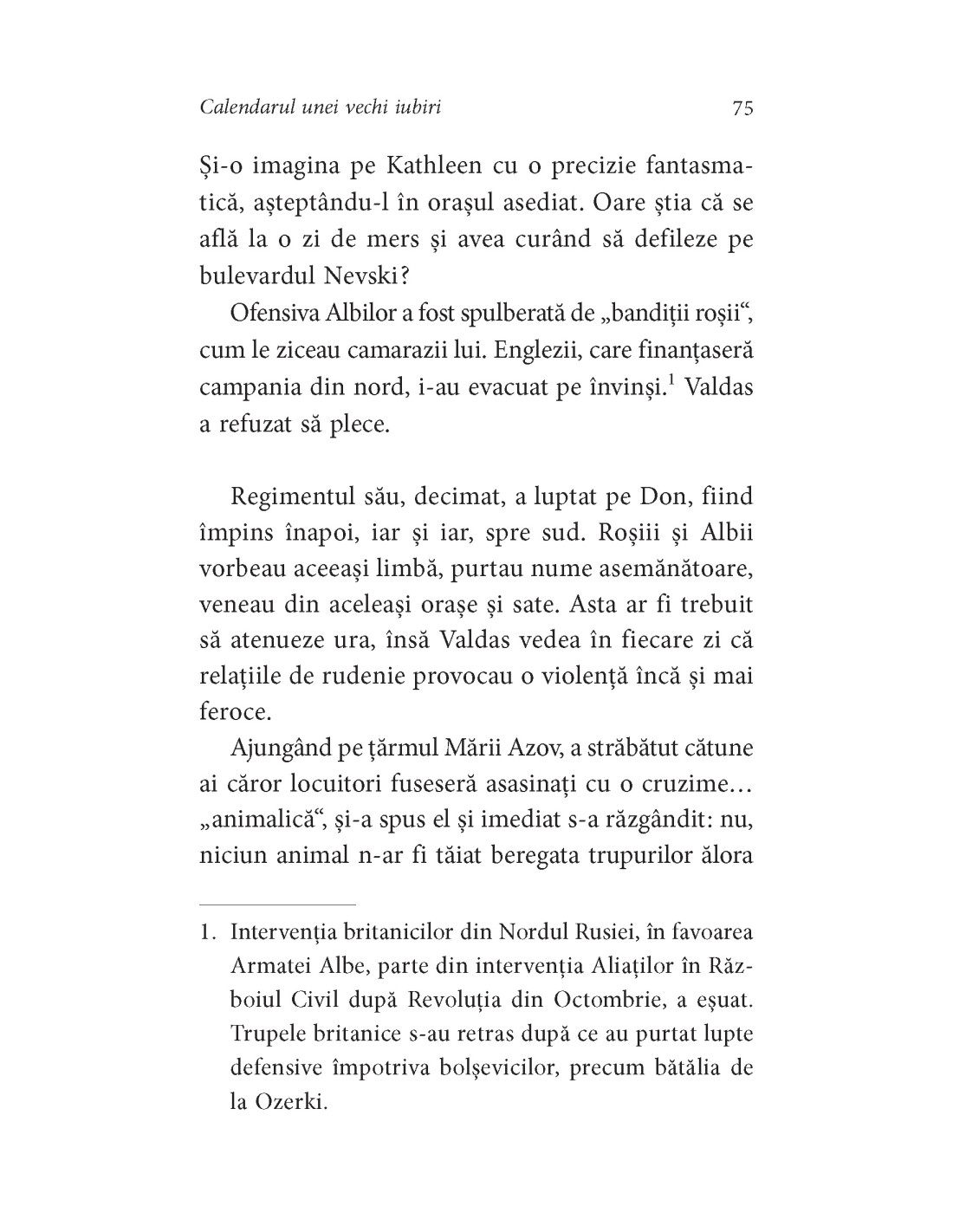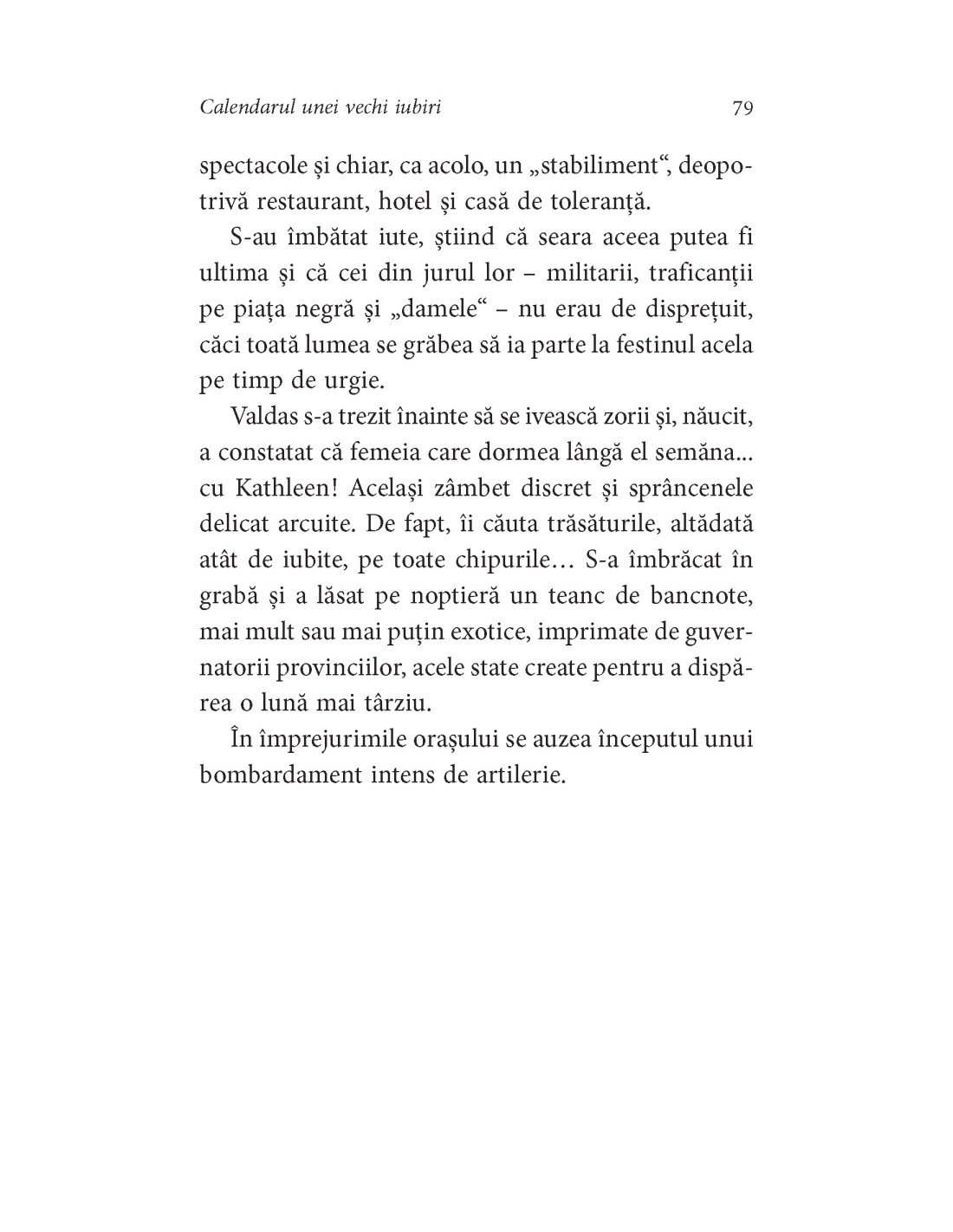 Romanul Calendarul unei vechi iubiri spune povestea lui Valdas Bataev, care se vede obligat să înfrunte, încă de tânăr, evenimentele tragice ale epocii sale – secolul XX, un secol de furie şi sânge. Dar în mijlocul furtunii, Valdas reuşeşte să se sustragă cruzimii lumii: o iubire clandestină într-o paranteză fericită, între calendarul pe stil vechi al Rusiei ţariste şi noua cronologie impusă de „constructorii unui viitor luminos”.