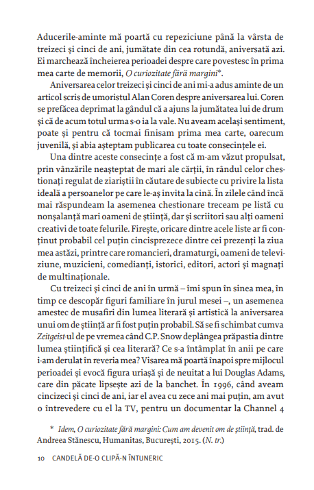 Candelă de-o clipă-n întuneric este continuarea firească și mult așteptată a bestsellerului O curiozitate fără margini, ce cuprinde prima parte a vieții unuia dintre cei mai mari oameni de ştiinţă şi gânditori contemporani. De data aceasta, Richard Dawkins își reamintește cu umor și spirit critic viața dedicată științei și descoperirii. Explorând efectele pe care publicarea Genei egoiste le-a avut asupra biologiei ca ştiinţă, descriind cu ironie și cu afecțiune lumea academică, cea editorială și cea audiovizuală și presărând paginile cu povești nostime despre oamenii importanți pe care i-a întâlnit, Dawkins ne înfățișează cu sinceritate evenimentele și ideile care l-au încurajat în eforturile sale intelectuale la intersecția culturii, religiei și științei.