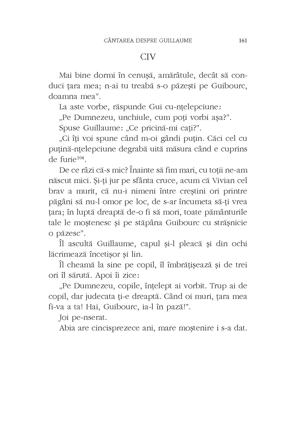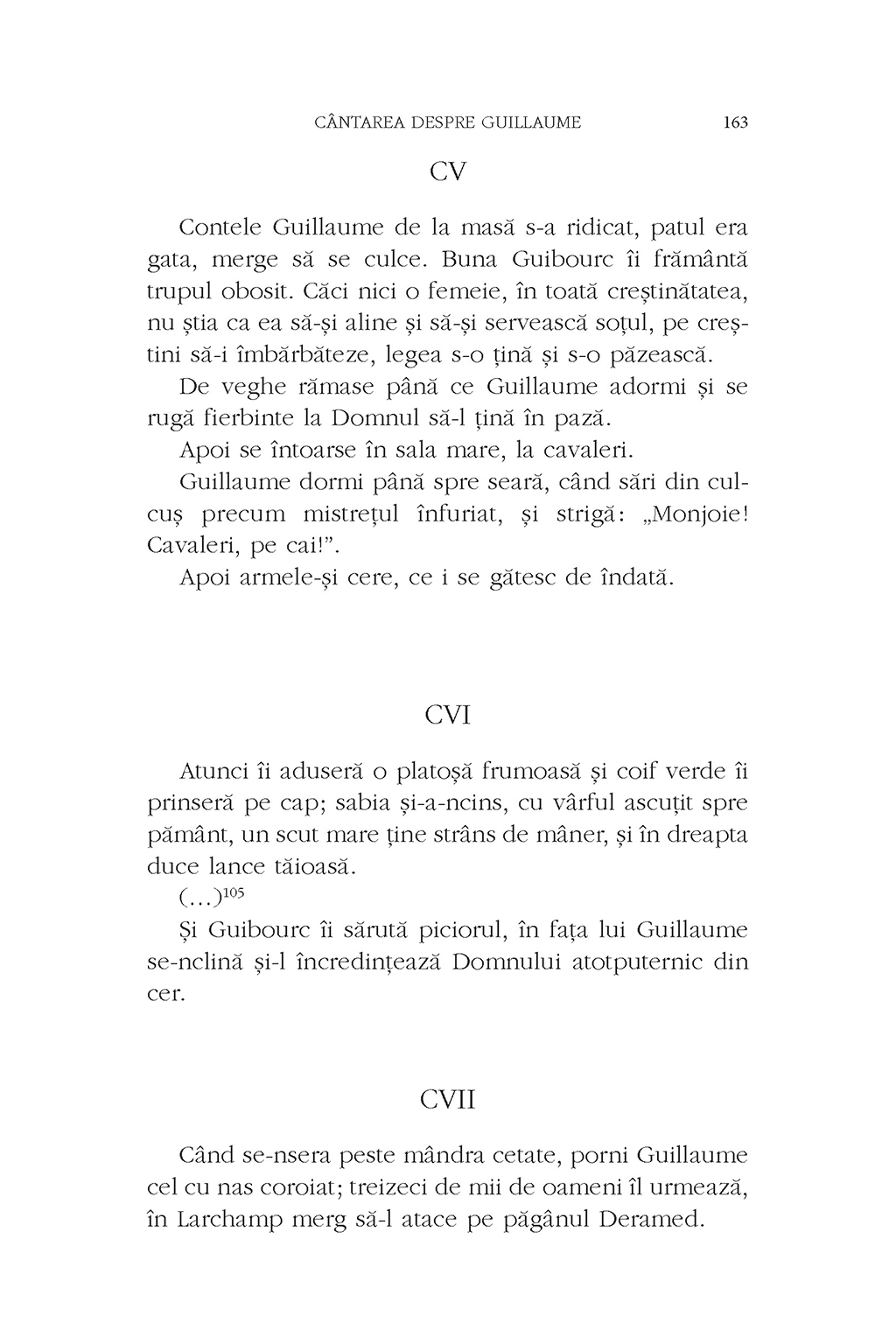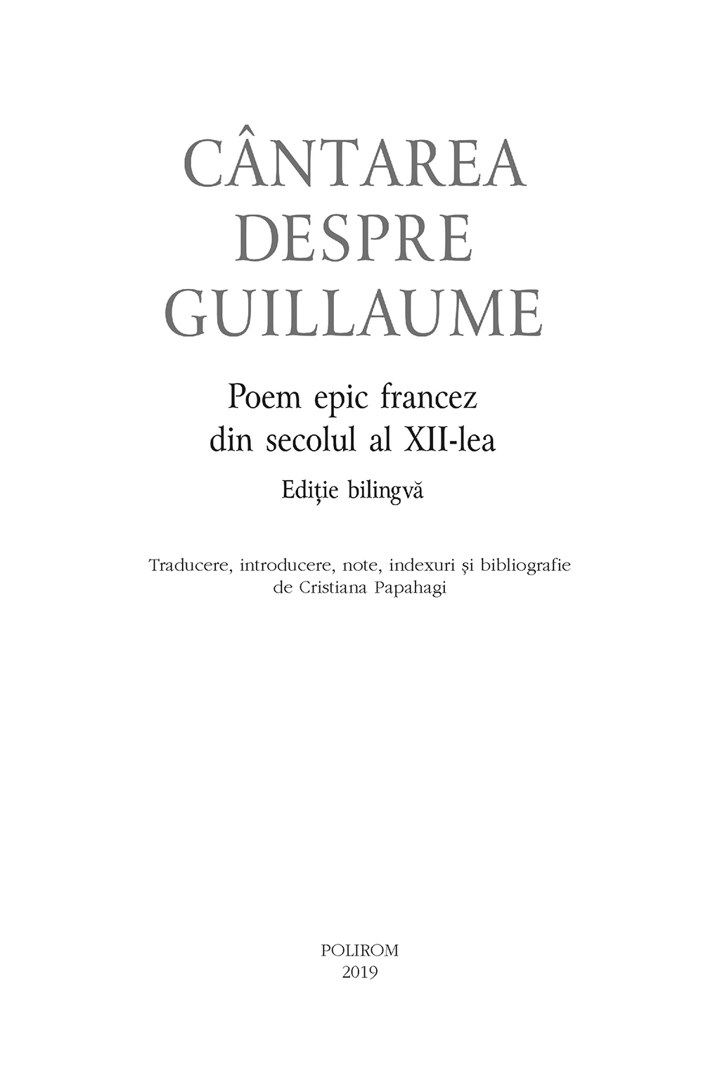 Cîntarea despre Guillaume este cea mai veche epopee franceză după Roland. Textul povesteşte luptele eroilor carolingieni împotriva invadatorilor sarazini şi se constituie implicit într-o pledoarie pentru cruciadă, în secolul al XII-lea. Tradus, adaptat şi continuat în literaturile franceză, germană şi italiană, poemul reprezintă nucleul celui mai bogat filon epic medieval. Totodată, este martorul precoce al unei estetici specific franceze, în care tragicul se amestecă cu comicul, hiperbola cu realismul crud, tradiţia rigidă cu inovaţia ironică, într-un text de o surprinzătoare modernitate. Păstrată într-un singur manuscris, descoperit abia în 1901, Cîntarea despre Guillaume este tradusă şi publicată acum pentru prima dată în limba română.