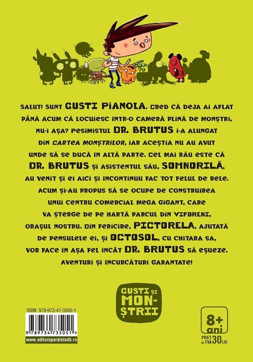 Salut! Sunt GUSTI Pianola. Cred că deja ai aflat până acum că locuiesc într‑o cameră plină de monștri, nu‑i așa? Pesimistul Dr. BRUTUS i‑a alungat din Cartea monștrilor, iar aceștia nu au avut unde să se ducă în altă parte. Cel mai rău este că Dr. BRUTUS și asistentul său, SOMNORILĂ, au venit și ei aici și încontinuu fac tot felul de rele. Acum și‑au propus să se ocupe de construirea unui centru comercial mega gigant, care va șterge de pe hartă parcul din VIFORENI, orașul nostru. Din fericire, PICTORELA, ajutată de pensulele ei, și OCTOSOL, cu chitara sa, vor face în așa fel încât Dr. BRUTUS să eșueze. Aventuri și încurcături garantate!