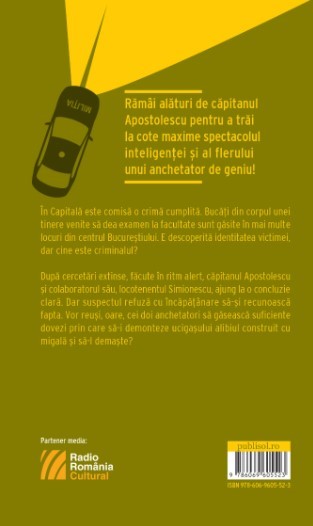 In Capitala este comisa o crima cumplita. Bucati din corpul unei tinere venite sa dea examen la facultate sunt gasite in mai multe locuri din centrul Bucurestiului. E descoperitaidentitatea victimei, dar cine este criminalul?Dupa cercetari extinse, facute in ritm alert, capitanul Apostolescu si colaboratorul sau,locotenentul Simionescu, ajung la o concluzie clara. Dar suspectul refuza cu incapatanare sa-si recunoasca fapta. Vor reusi, oare, cei doi anchetatori sa gaseasca sufi ciente doveziprin care sa-i demonteze ucigasului alibiul construit cu migala si sa-l demaste?
