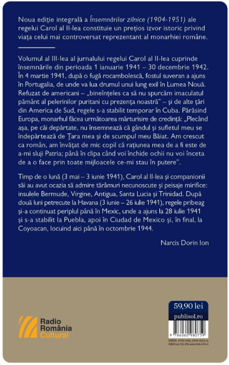 Volumul al III-lea al jurnalului regelui Carol al II-lea cuprinde insemnarile din perioada 1 ianuarie 1941 – 30 decembrie 1942. In 4 martie 1941, dupa o fuga rocambolesca, fostul suveran a ajuns in Portugalia, de unde va lua drumul unui lung exil in Lumea Noua. Refuzat de americani – „bineinteles ca sa nu spurcam imaculatul pamant al pelerinilor puritani cu prezenta noastra” – si de alte tari din America de Sud, regele s-a stabilit temporar in Cuba.