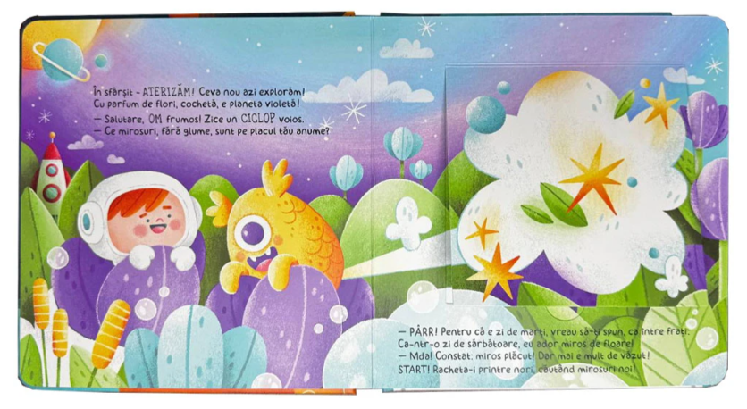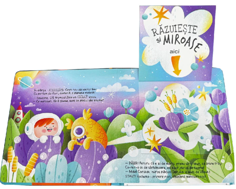 Arome Galactice de Răzuit: Explorarea spațiului capătă o nouă dimensiune! Copiii sunt invitați să răzuiască zonele special marcate pentru a elibera arome amuzante, fructate și complet surprinzătoare.