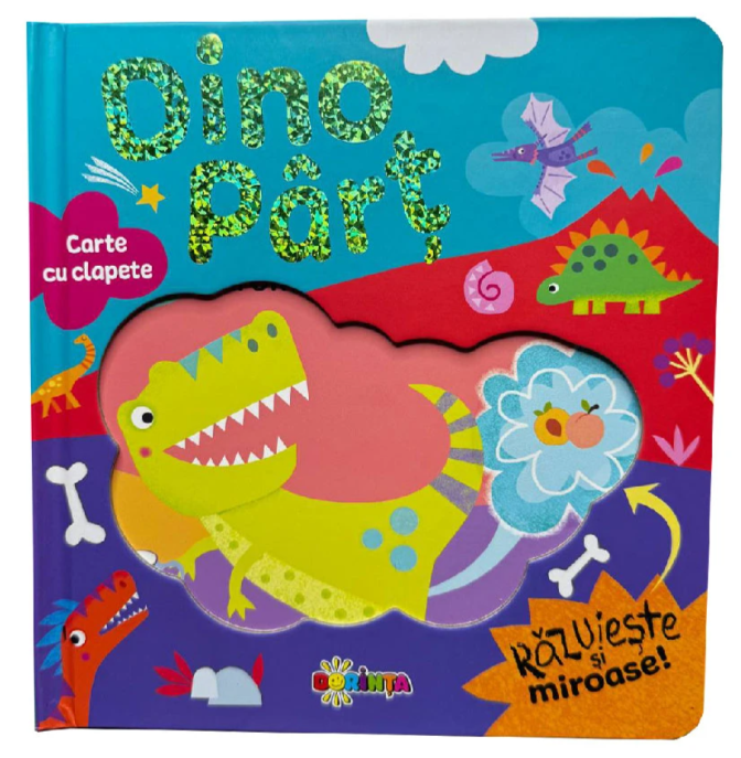 Uită de cărțile plictisitoare! Aici, fiecare pagină aduce o surpriză ascunsă sub clapete și un miros pe măsură. Oare a ce miroase un dinozaur petrecăreț?