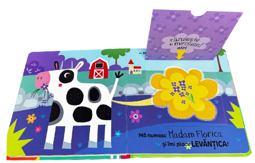 Clapete interactive: Mânuțele curioase sunt încurajate să ridice clapetele colorate (cum ar fi floarea uriașă) pentru a descoperi ilustrațiile și aromele ascunse, dezvoltând astfel motricitatea fină.