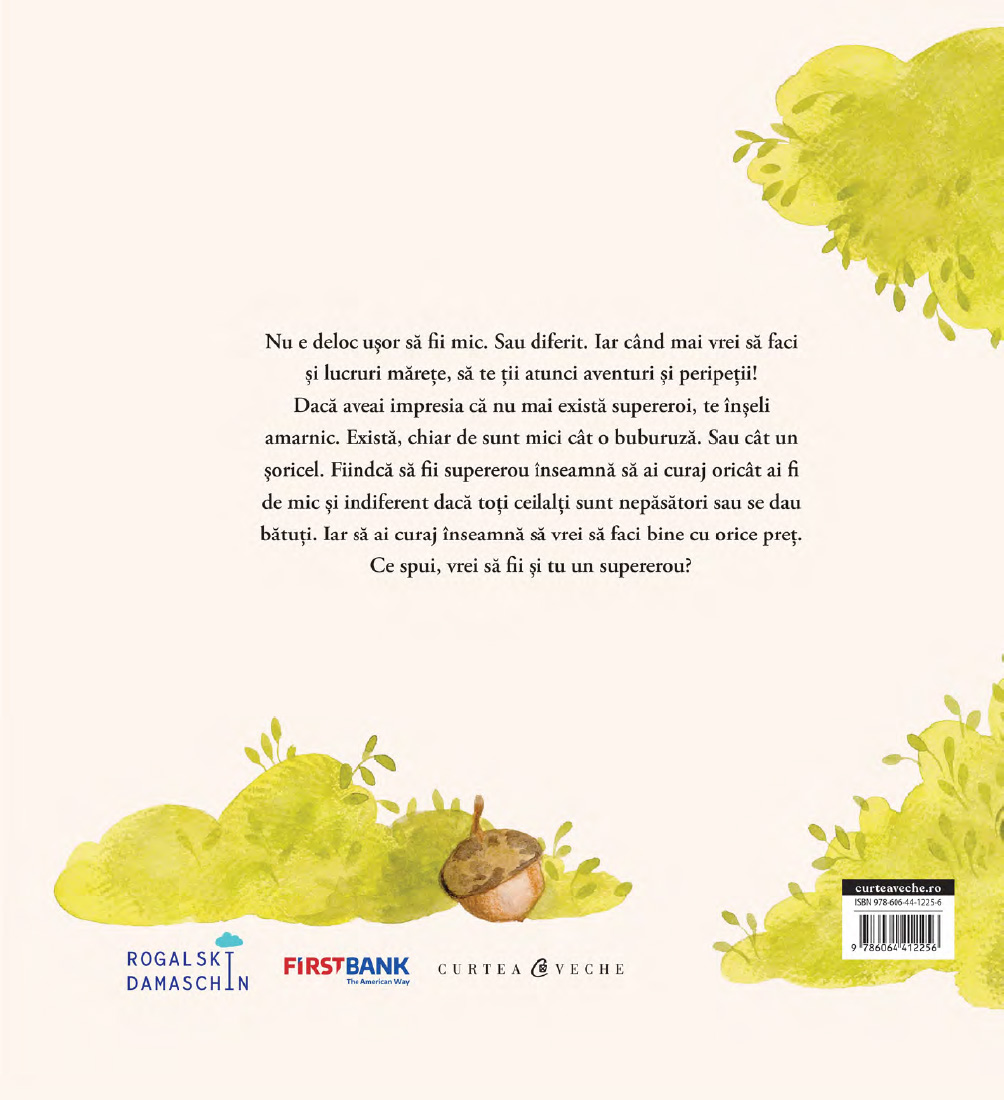 Nu e deloc ușor să fii mic. Sau diferit. Iar când mai vrei să faci și lucruri mărețe, să te ții atunci aventuri și peripeții! Dacă aveai impresia că nu mai există supereroi, te înșeli amarnic. Există, chiar de sunt mici cât o buburuză. Sau cât un șoricel. Fiindcă să fii supererou înseamnă să ai curaj oricât ai fi de mic și indiferent dacă toți ceilalți sunt nepăsători sau se dau bătuți. Iar să ai curaj înseamnă să vrei să faci bine cu orice preț. Ce spui, vrei să fii și tu un supererou?