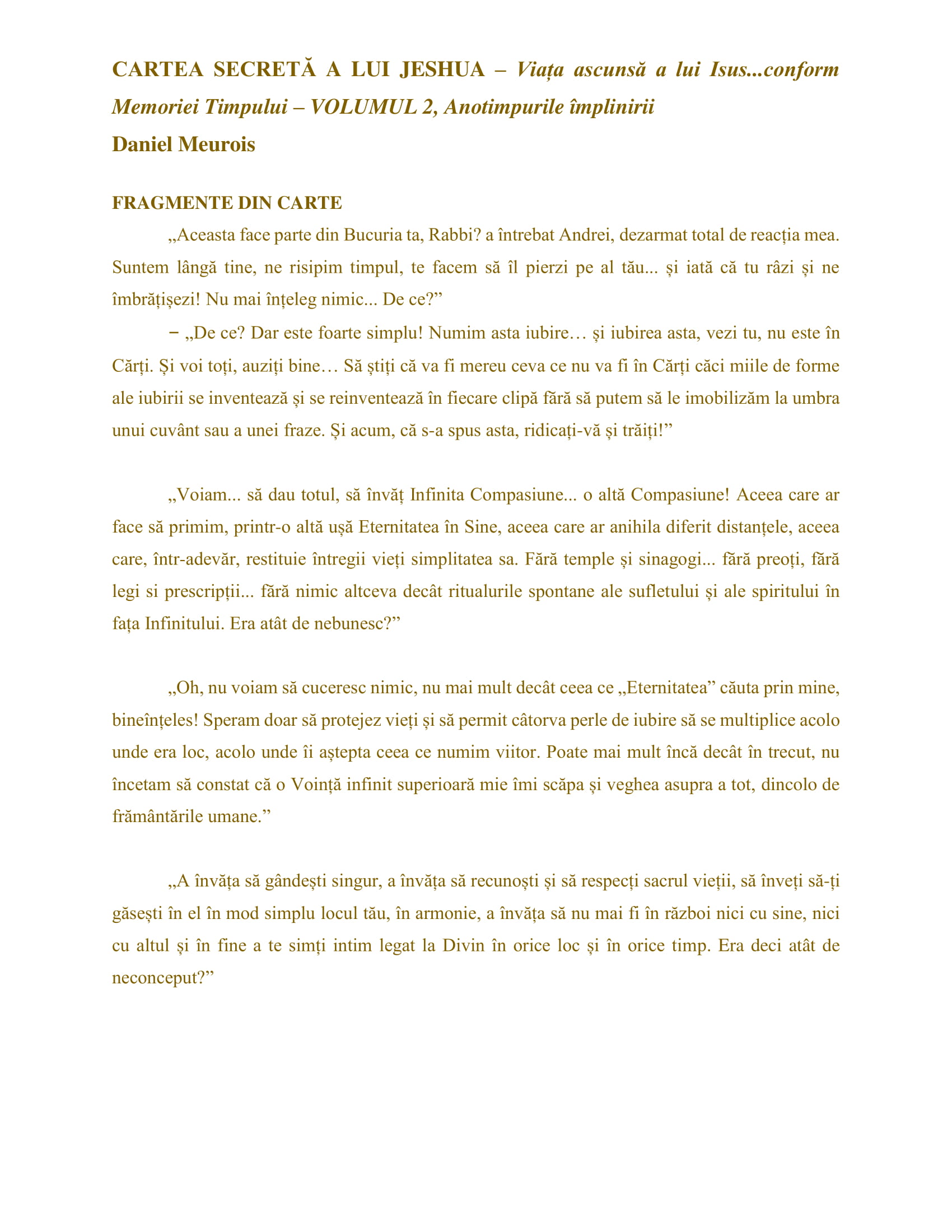 Purtați de o relatare vie, vom fi atinşi de intensitatea şi de numărul mare de detalii culese de autor cu scopul de a ne aduce întotdeauna mai departe către orizonturile luminoase şi libere de orice apartenenţă. De la înmulţirea pâinilor până la misterul crucificării, trecând prin înţelegerea adevăratului rol al lui Iuda, ajungem până la dilatarea conştiinţei. Această mărturie de o tandreţe cutremurătoare o să ne conducă în sfârşit în gândurile Maestrului în timp ce se întoarce spre Himalaya. Un suflu de Pace şi o viziune fără precedent a călătoriei Celui care a încarnat divinul rămânând om în acelaşi timp... o carte pentru a iubi Iubirea... o capodoperă impozantă care va rămâne în timp.