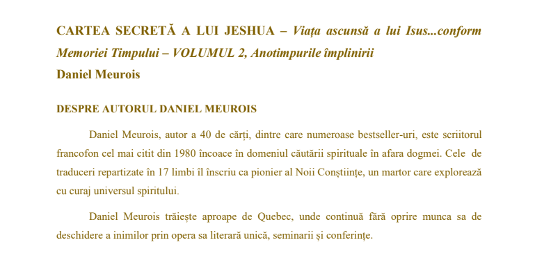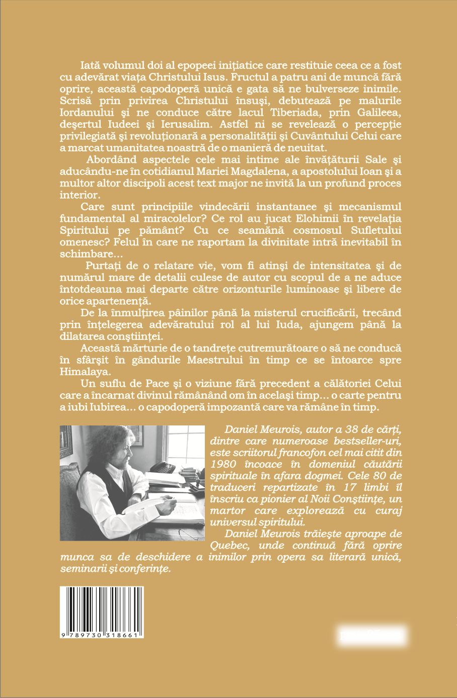... iată volumul doi al epopeei inițiatice care restituie ceea ce a fost cu adevărat viața Christului Iisus. Fructul a patru ani de muncă fără oprire, această capodoperă unică e gata să ne bulverseze inimile. Scrisă prin privirea Christului însuşi, debutează pe malurile Iordanului şi ne conduce către lacul Tiberiada, prin Galileea, deşertul Iudeei şi Ierusalim. Astfel ni se revelează o percepție privilegiată şi revoluţionară a personalităţii şi Cuvântului Celui care a marcat umanitatea noastră de o manieră de neuitat.