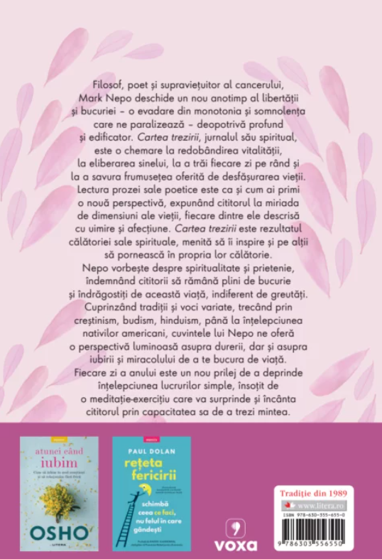 Filosof, poet și supraviețuitor al cancerului, Mark Nepo deschide un nou anotimp al libertății și bucuriei – o evadare din monotonia și somnolența care ne paralizează – deopotrivă profund și edificator. Cartea trezirii, jurnalul său spiritual, este o chemare la redobândirea vitalității, la eliberarea sinelui, la a trăi fiecare zi pe rând și la a savura frumusețea oferită de desfășurarea vieții.