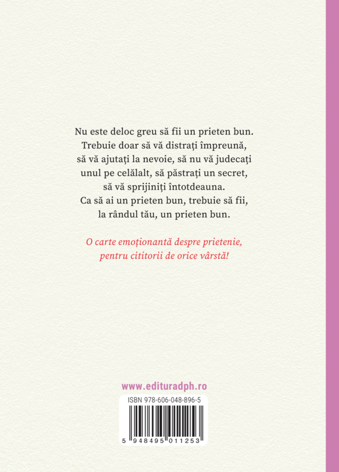 Cartea îi învață pe cei mici că nu este greu să fii un prieten bun: trebuie doar să te distrezi împreună, să ajuți atunci când e nevoie, să păstrezi secrete, să nu judeci și să oferi sprijin necondiționat. Mesajul simplu și cald, însoțit de ilustrații pline de expresivitate, îi inspiră pe copii să fie ei înșiși prieteni adevărați.