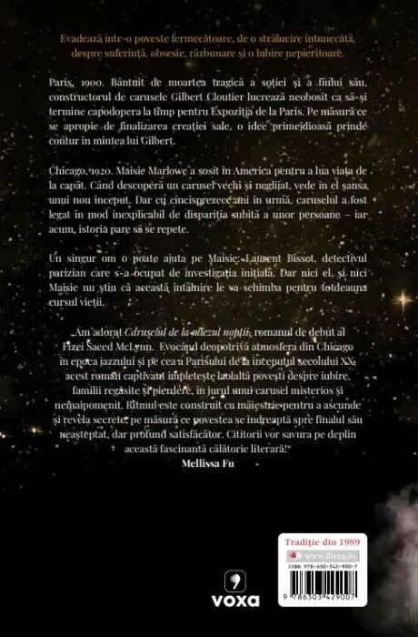„Am adorat Caruselul de la miezul nopții, romanul de debut al Fizei Saeed McLynn. Evocând deopotrivă atmosfera din Chicago în epoca jazzului și pe cea a Parisului de la începutul secolului XX, acest roman captivant împletește laolaltă povești despre iubire, familii regăsite și pierdere, în jurul unui carusel misterios și nemaipomenit. Ritmul este construit cu măiestrie pentru a ascunde și revela secrete, pe măsură ce povestea se îndreaptă spre finalul său neașteptat, dar profund satisfăcător. Cititorii vor savura pe deplin această fascinantă călătorie literară!“ Mellissa Fu