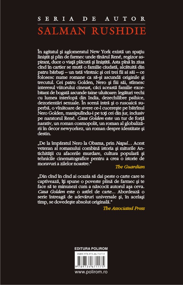 În agitatul şi aglomeratul New York există un spaţiu liniştit şi plin de farmec unde tînărul René, regizor aspirant, duce o viaţă plăcută şi liniştită. Asta pînă în ziua cînd în cartier se mută o familie ciudată, alcătuită din patru bărbaţi – un tată vîrstnic şi cei trei fii ai săi – ce folosesc nume romane ca să-şi ascundă originile şi trecutul. Cei patru Golden, Nero şi fiii săi, stîrnesc interesul viitorului cineast, căci această familie exorbitant de bogată ascunde taine uluitoare: legături vechi cu lumea interlopă din India, dezechilibre psihice, dezorientări sexuale. În scenă intră şi o rusoaică superbă, o vînătoare de avere ce-l cucereşte pe bătrînul Nero Golden, manipulîndu-i pe toţi cei din jur, inclusiv pe naratorul René. Casa Golden este un tur de forţă narativ, un roman cosmopolit, un roman al globalizării în decor newyorkez, un roman despre identitate şi destin.