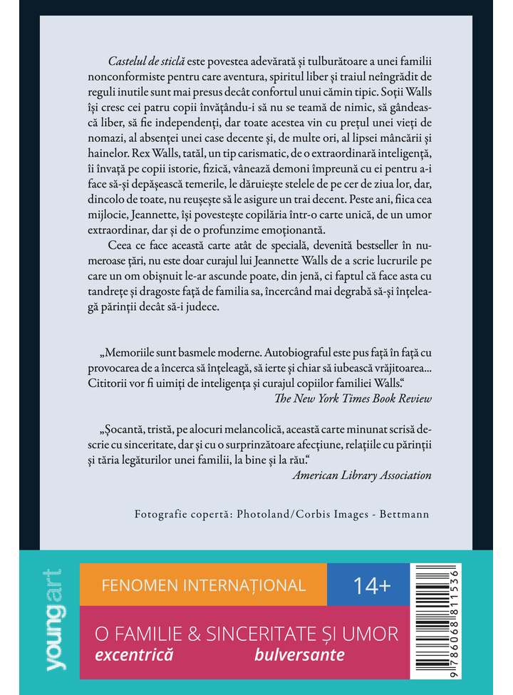 Castelul de sticlă este povestea adevărată și tulburătoare a unei familii nonconformiste pentru care aventura, spiritul liber și traiul neîngrădit de reguli inutile sunt mai presus decât confortul unui cămin tipic. Soții Walls își cresc cei patru copii învățându-i să nu se teamă de nimic, să gândească liber, să fie independenți, dar toate acestea vin cu prețul unei vieți de nomazi, al absenței unei case decente și, de multe ori, al lipsei mâncării și hainelor. Rex Walls, tatăl, un tip carismatic, de o extraordinară inteligență, îi învață pe copii istorie, fizică, vânează demoni împreună cu ei pentru a-i face să-și depășească temerile, le dăruiește stelele de pe cer de ziua lor, dar, dincolo de toate, nu reușește să le asigure un trai decent. Peste ani, fiica cea mijlocie, Jeannette, își povestește copilăria într-o carte unică, de un umor extraordinar, dar și de o profunzime emoționantă.