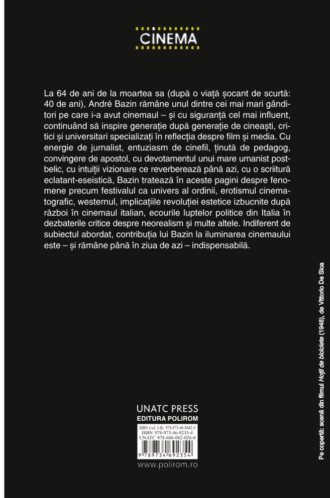 La 64 de ani de la moartea sa (după o viață șocant de scurtă: 40 de ani), André Bazin rămâne unul dintre cei mai mari gânditori pe care i-a avut cinemaul – și cu siguranță cel mai influent, continuând să inspire generație după generație de cineaști, critici și universitari specializați în reflecția despre film și media. Cu energie de jurnalist, entuziasm de cinefil, ținută de pedagog, convingere de apostol, cu devotamentul unui mare umanist postbelic, cu intuiții vizionare ce reverberează până azi, cu o scriitură eclatant-eseistică, Bazin tratează în aceste pagini despre fenomene precum festivalul ca univers al ordinii, erotismul cinematografic, westernul, implicațiile revoluției estetice izbucnite după război în cinemaul italian, ecourile luptelor politice din Italia în dezbaterile critice despre neorealism și multe altele. Indiferent de subiectul abordat, contribuția lui Bazin la iluminarea cinemaului este – și rămâne până în ziua de azi – indispensabilă.