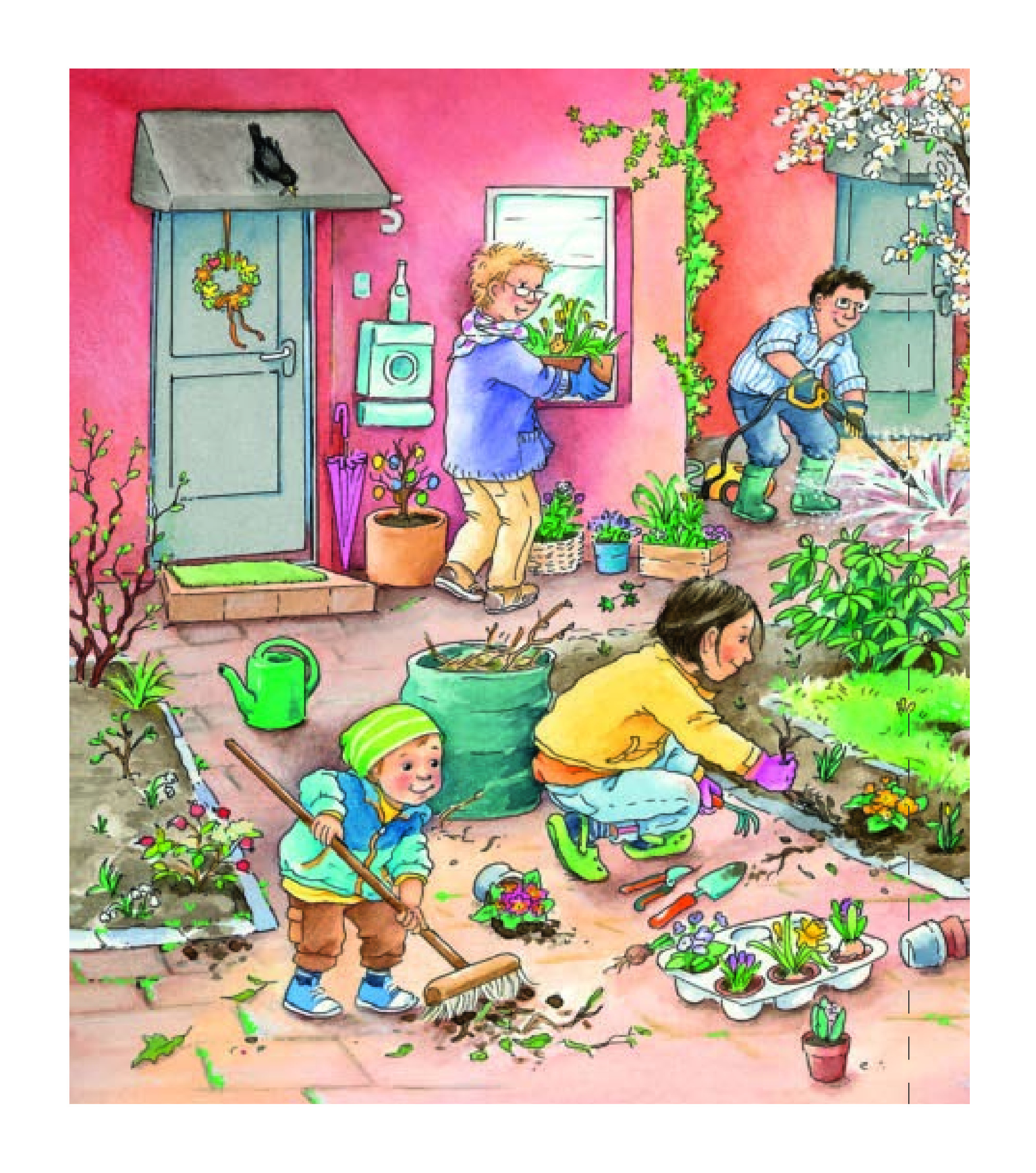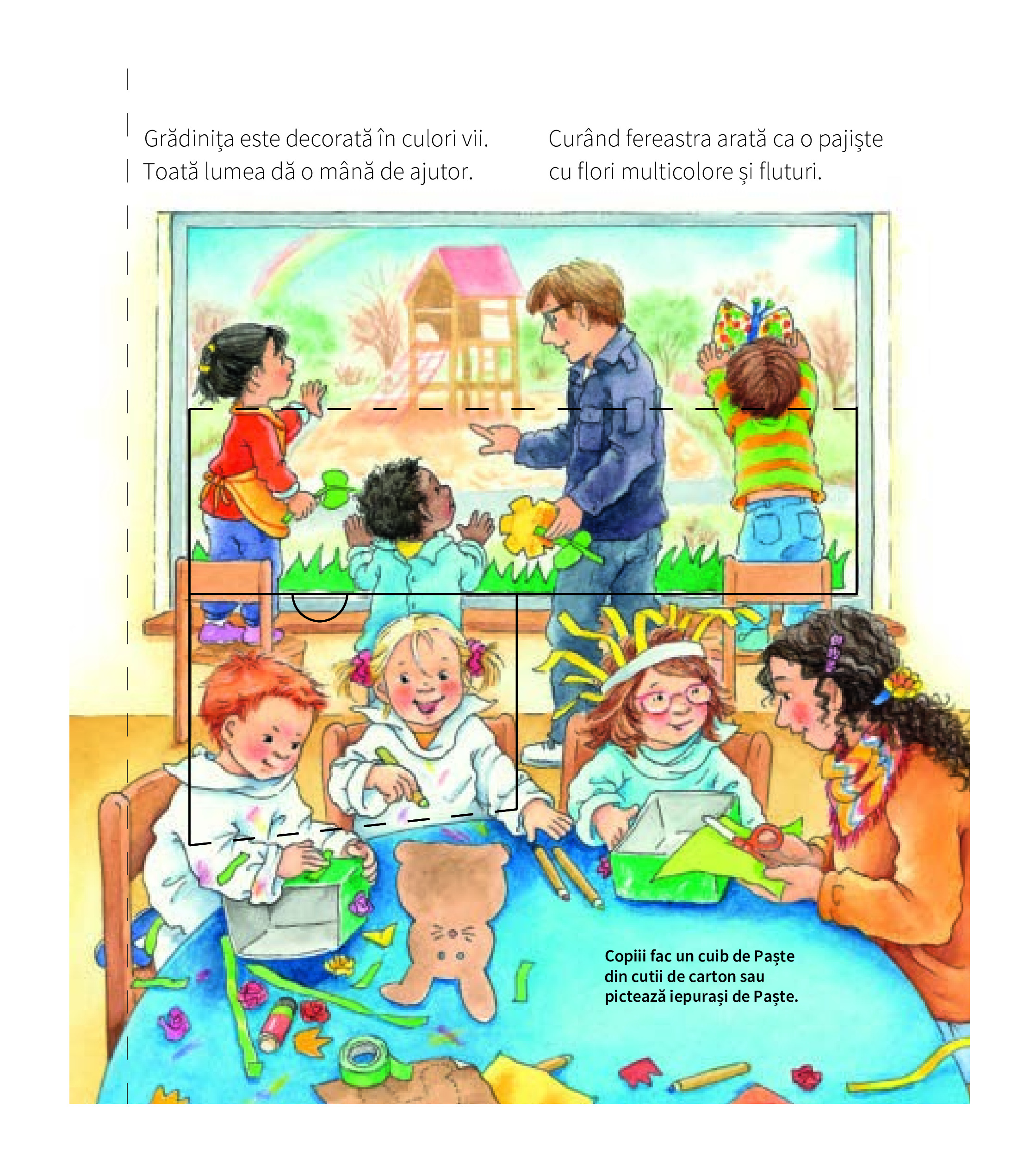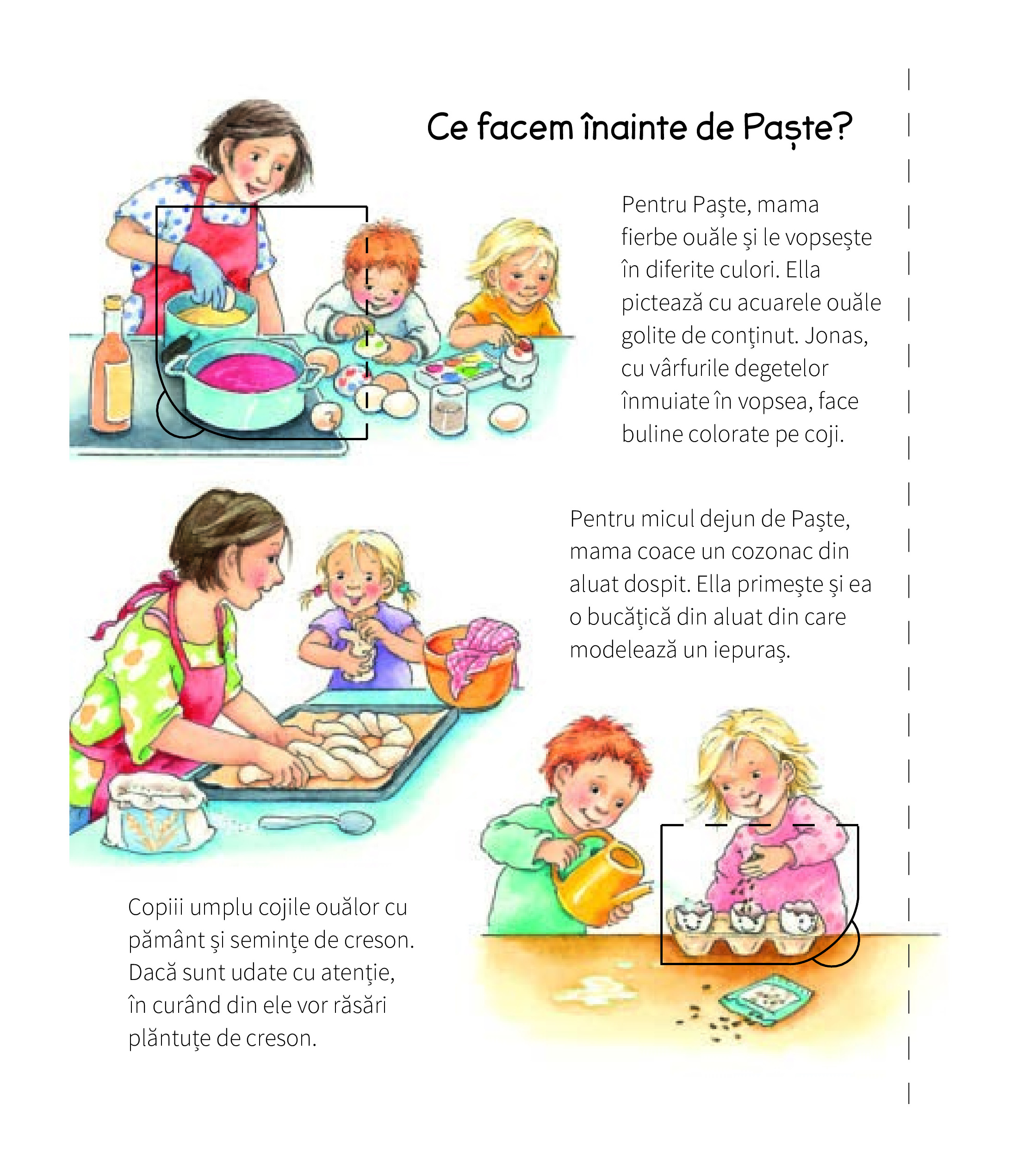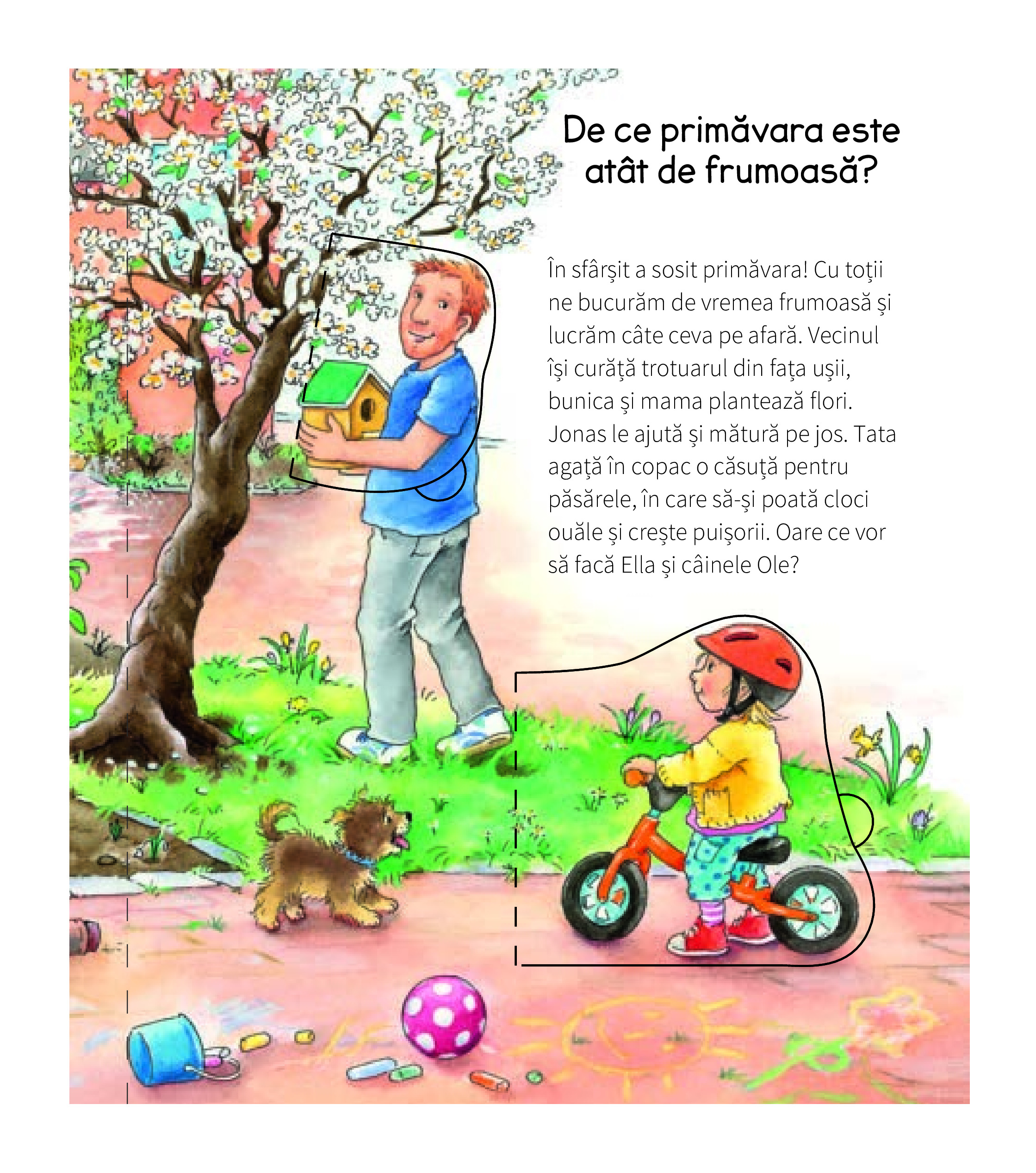 Haideți să descoperim împreună pe paginile cartonate ale cărții. Ferestrele pentru explorare interactivă îți vor arăta mai multe despre mersul cu bicicleta în primele zile calde, plantatul de flori și pregătirile pentru Paște.