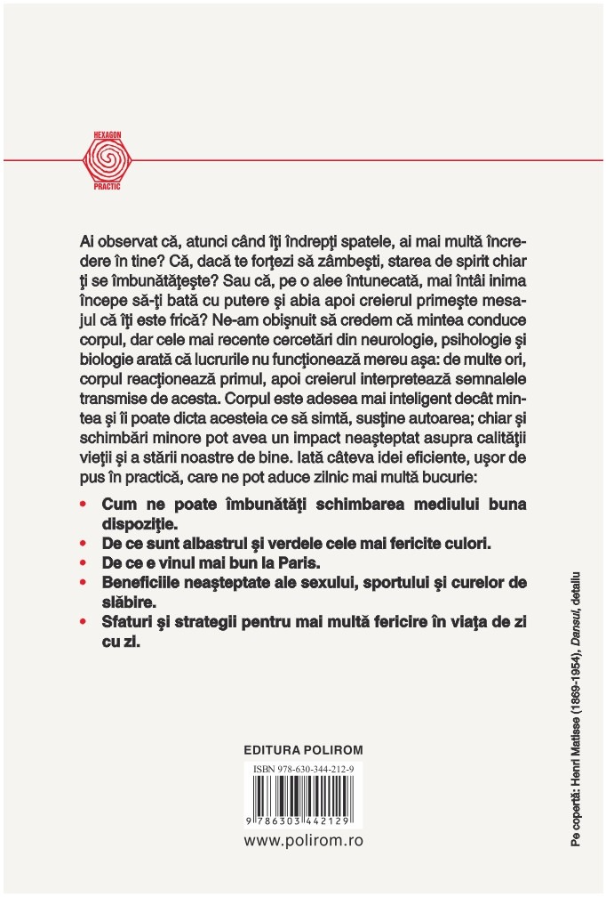 Ai observat că, atunci când îți îndrepți spatele, ai mai multă încredere în tine? Că, dacă te forțezi să zâmbești, starea de spirit chiar ți se îmbunătățește? Sau că, pe o alee întunecată, mai întâi inima începe să-ți bată cu putere și abia apoi creierul primește mesajul că îți este frică? Ne-am obișnuit să credem că mintea conduce corpul, dar cele mai recente cercetări din neurologie, psihologie și biologie arată că lucrurile nu funcționează mereu așa: de multe ori, corpul reacționează primul, apoi creierul interpretează semnalele transmise de acesta.