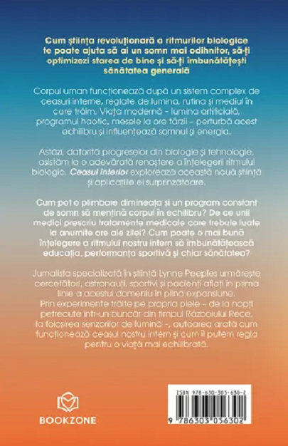 Jurnalista specializată în știință Lynne Peeples urmărește cercetători, astronauți, sportivi și pacienți aflați în prima linie a acestui domeniu în plină expansiune. Prin experimente trăite pe propria piele – de la nopți petrecute într-un buncăr din timpul Războiului Rece, la folosirea senzorilor de lumină –, autoarea arată cum funcționează ceasul nostru intern și cum îl putem regla pentru o viață mai echilibrată.