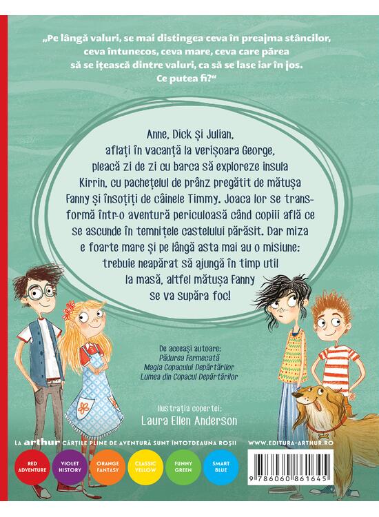 Pe lângă valuri, se mai distingea ceva în preajma stâncilor, ceva întunecos, ceva mare, ceva care părea să se ițească dintre valuri, ca să se lase iar în jos. Ce putea fi?”Anne, Dick și Julian, aflați în vacanță la domnișoara George, pleacă zi de zi cu barca să exploreze insula Kirrin, cu pachețelul de prânz pregătit de mătușa Fanny și însoțiți de câinele Timmy. Joaca lor se transformă într-o aventură periculoasă când copiii află ce se ascunde în temnițele castelului părăsit. Dar miza e foarte mare și pe lângă asta mai au o misiune: trebuie neapărat să ajungă în timp util la masă, altfel mătușa Fanny se va supăra foc!