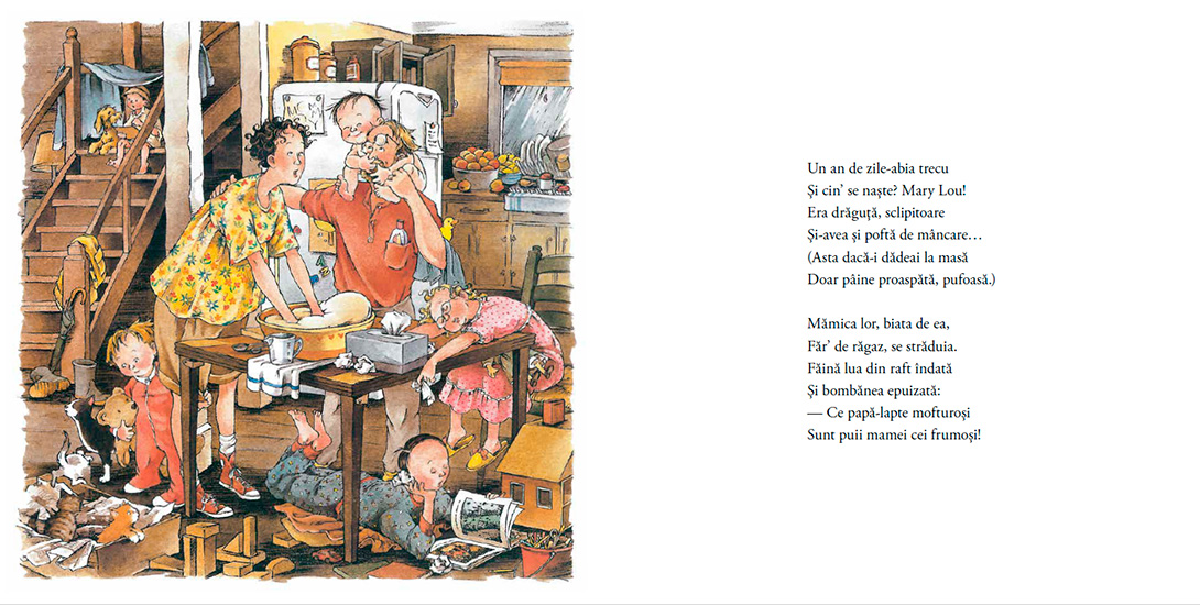 Când e vorba de mâncare, fiecare dintre cei șapte copiii ai familiei Peters are felul său preferat. Peter vrea doar lapte, nici prea cald, nici prea rece - doar el știe cum. Lucy vrea numai limonadă de casă - doar se face foarte ușor, nu? Pentru Jack, doar piureul de mere e bun, iar să curețe câteva kilograme zilnic chiar nu e mare lucru pentru domnul Peters. Gemenele preferă ouăle - una le vrea fierte, cealaltă prăjite - iar dacă doamna Peters le încurcă, au ele grijă să-i dea de înțeles cum e corect. Lui Jack, grișul cu lapte i se pare nemaipomenit - poți să-l împarți și cu pisica. Iar pentru Mary Lou, pâinea făcută în casă - zi de zi - e tot ce poate fi mai bun.