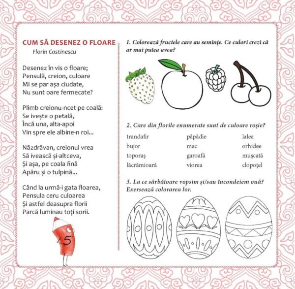 Cartea este destinată copiilor dornici să exploreze lumea culorilor şi să înveţe din armonia ei că orice culoare e frumoasă şi unică. Aici veți găsi: curiozități, ghicitori, poezii, diverse activități interesante și, bineînțeles, veți afla povestea culorilor.