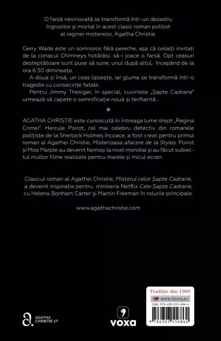 AGATHA CHRISTIE este cunoscută în întreaga lume drept „Regina Crimei“. Hercule Poirot, cel mai celebru detectiv din romanele polițiste de la Sherlock Holmes încoace, a fost creat pentru primul roman al Agathei Christie, Misterioasa afacere de la Styles. Poirot și Miss Marple au devenit faimoși la nivel mondial și au făcut subiectul multor filme realizate pentru marele și micul ecran.