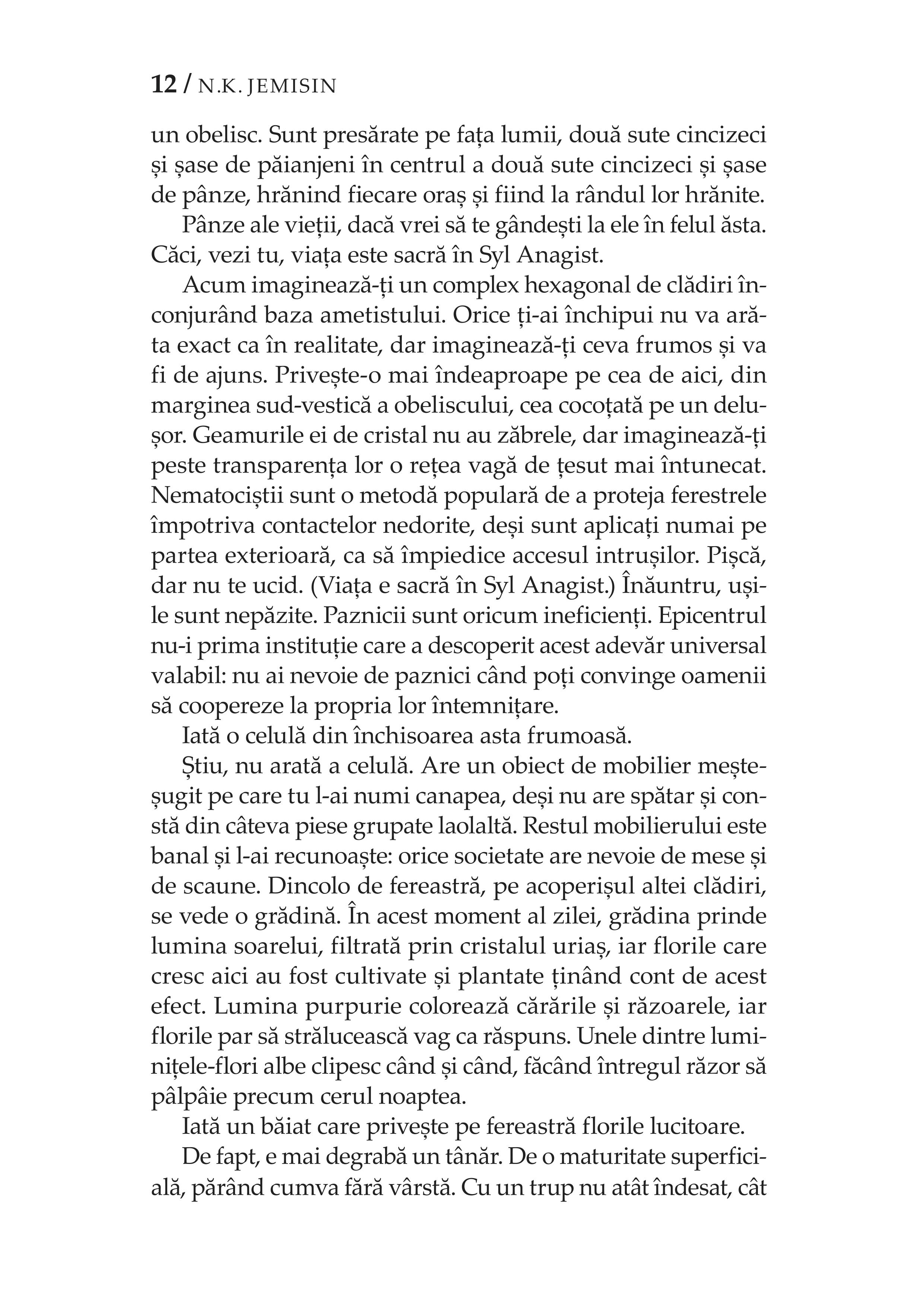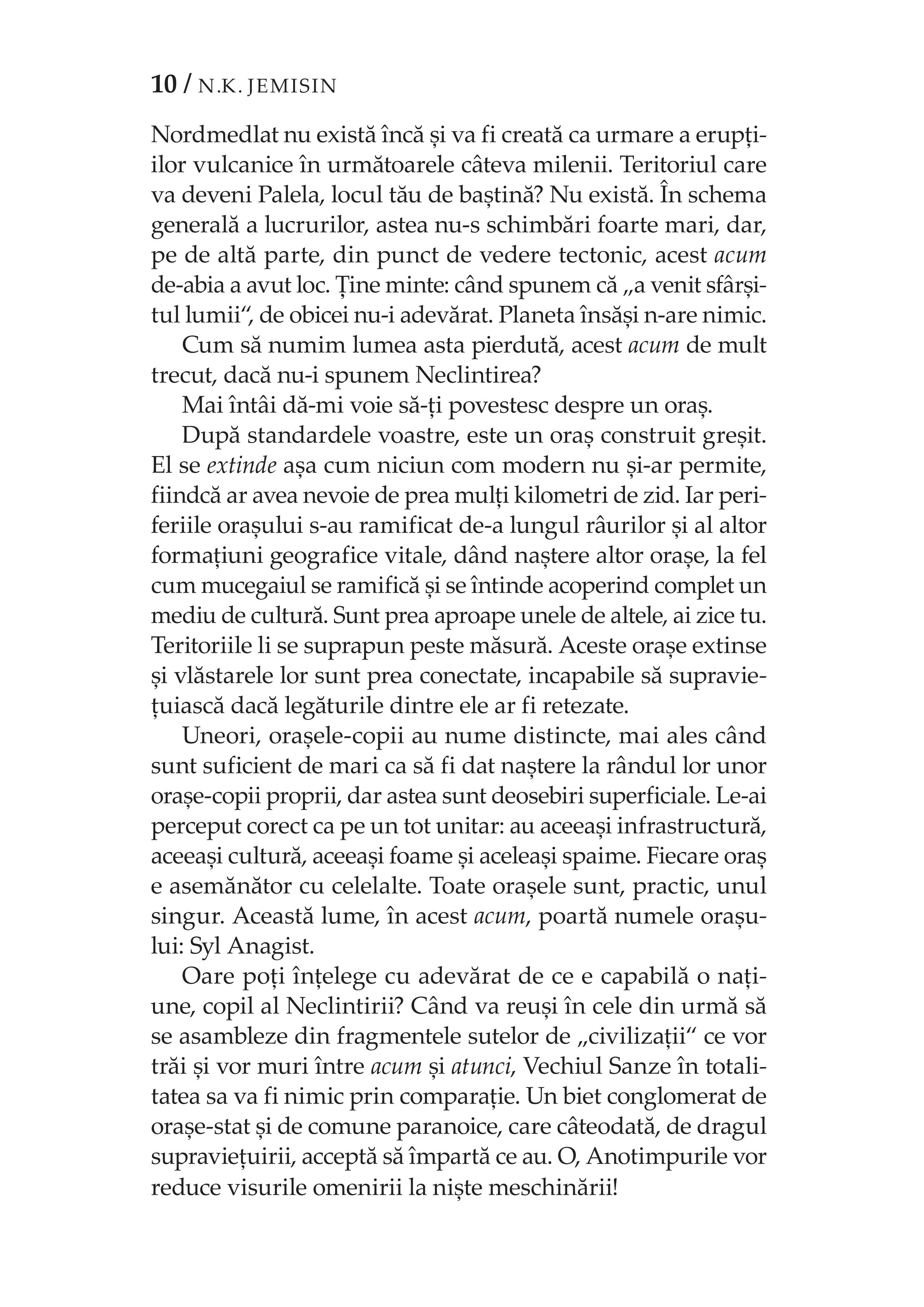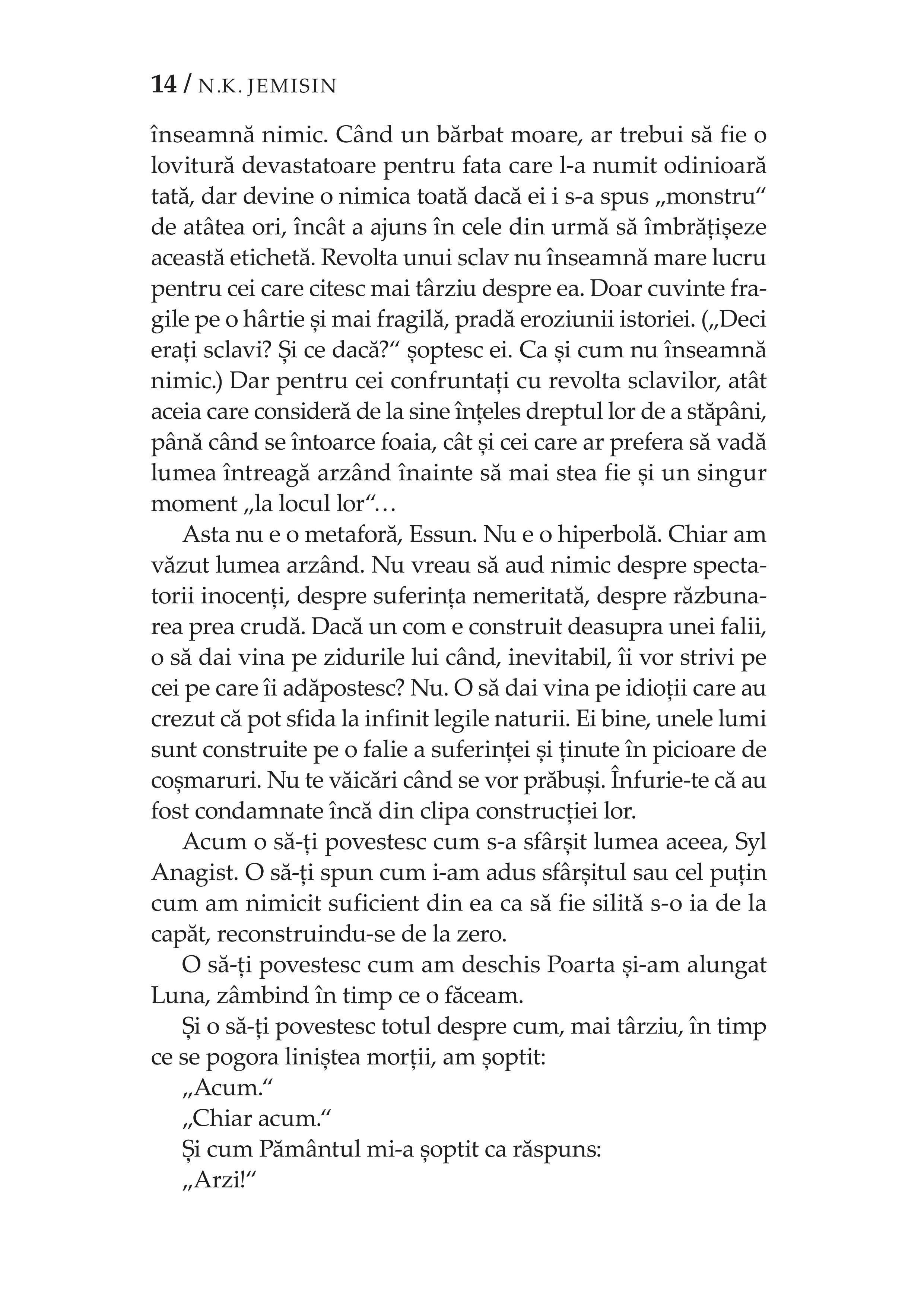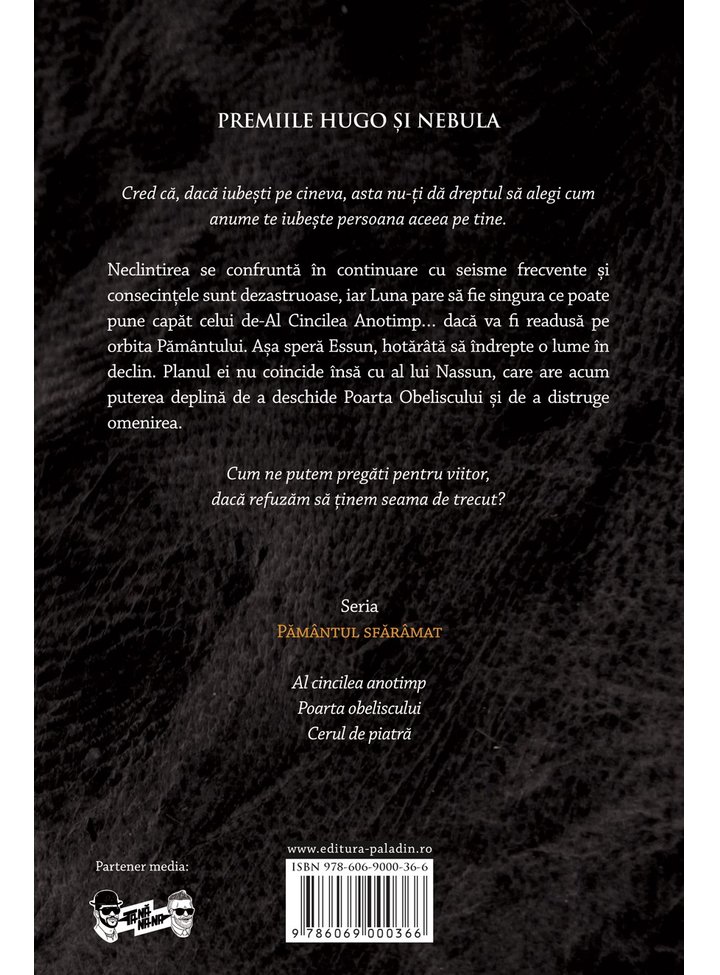 Neclintirea se confruntă în continuare cu seisme frecvente și consecințele sunt dezastruoase, iar Luna pare să fie singura ce poate pune capăt celui de-Al Cincilea Anotimp… dacă va fi readusă pe orbita Pământului. Așa speră Essun, hotărâtă să îndrepte o lume în declin. Planul ei nu coincide însă cu al lui Nassun, care are acum puterea deplină de a deschide Poarta Obeliscului și de a distruge omenirea.