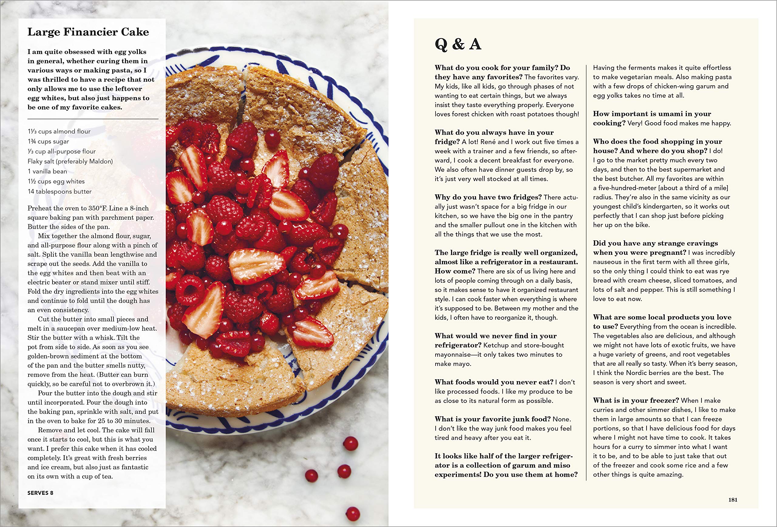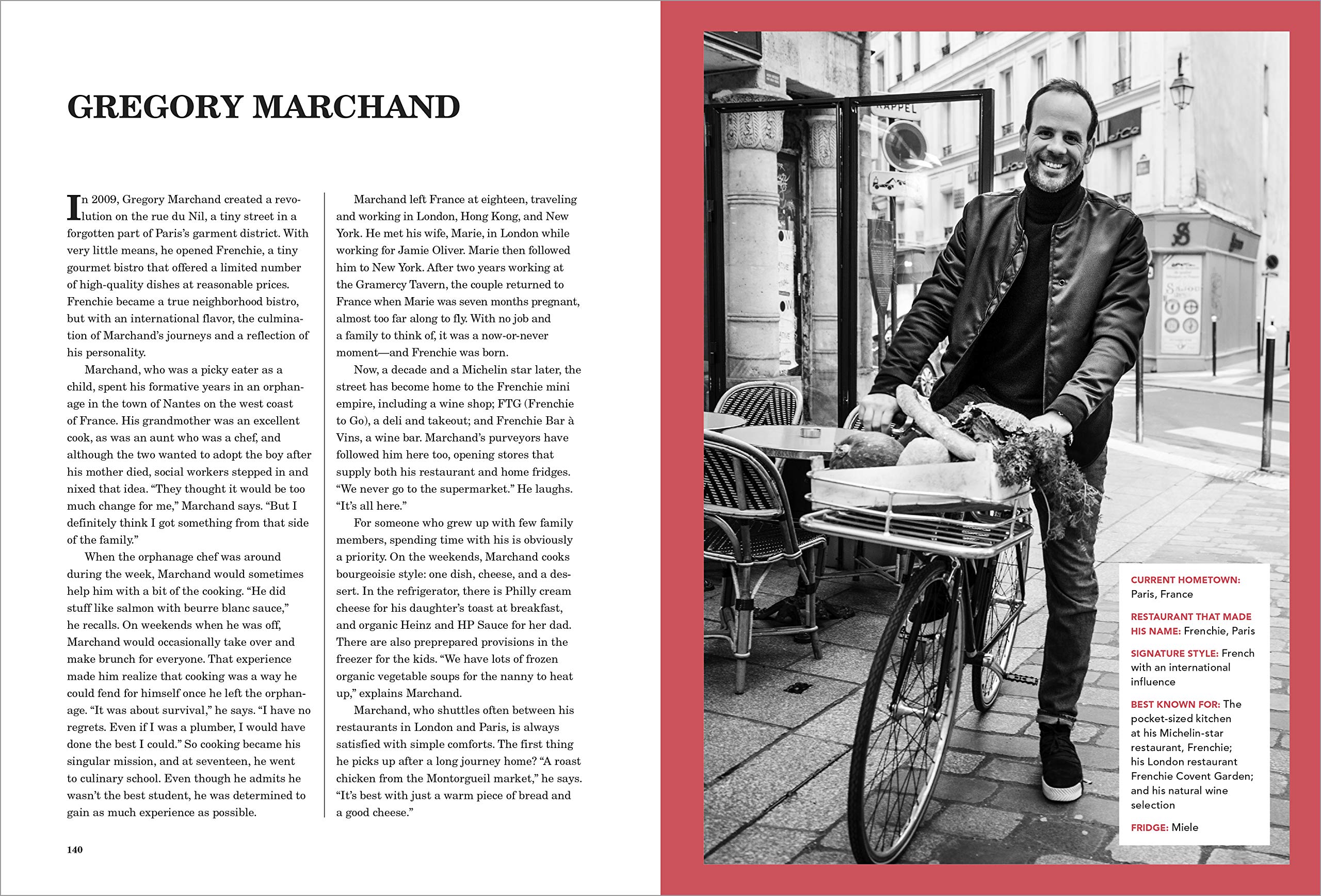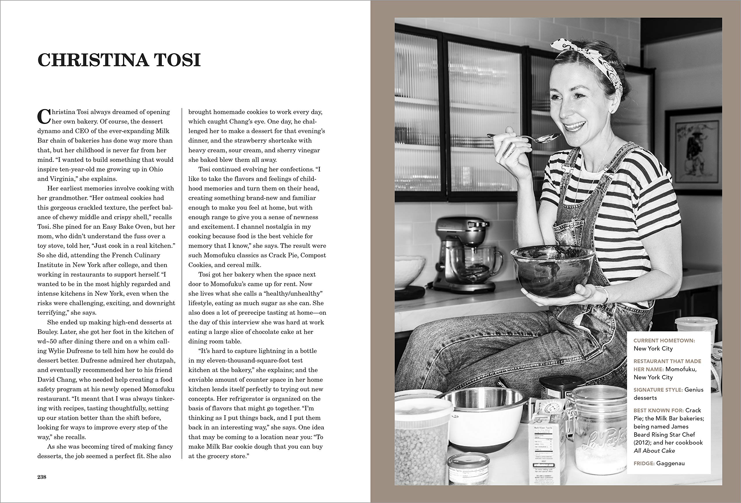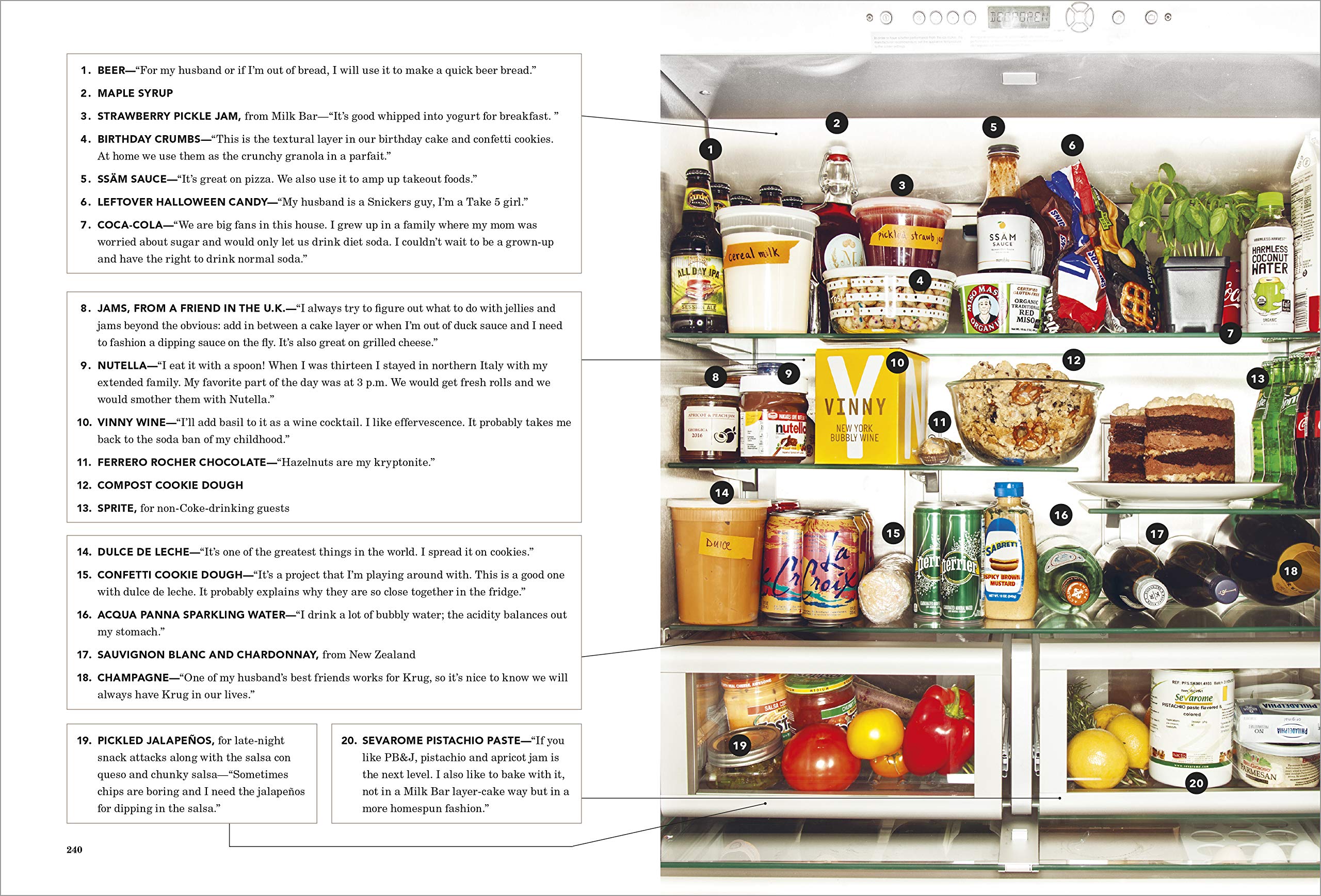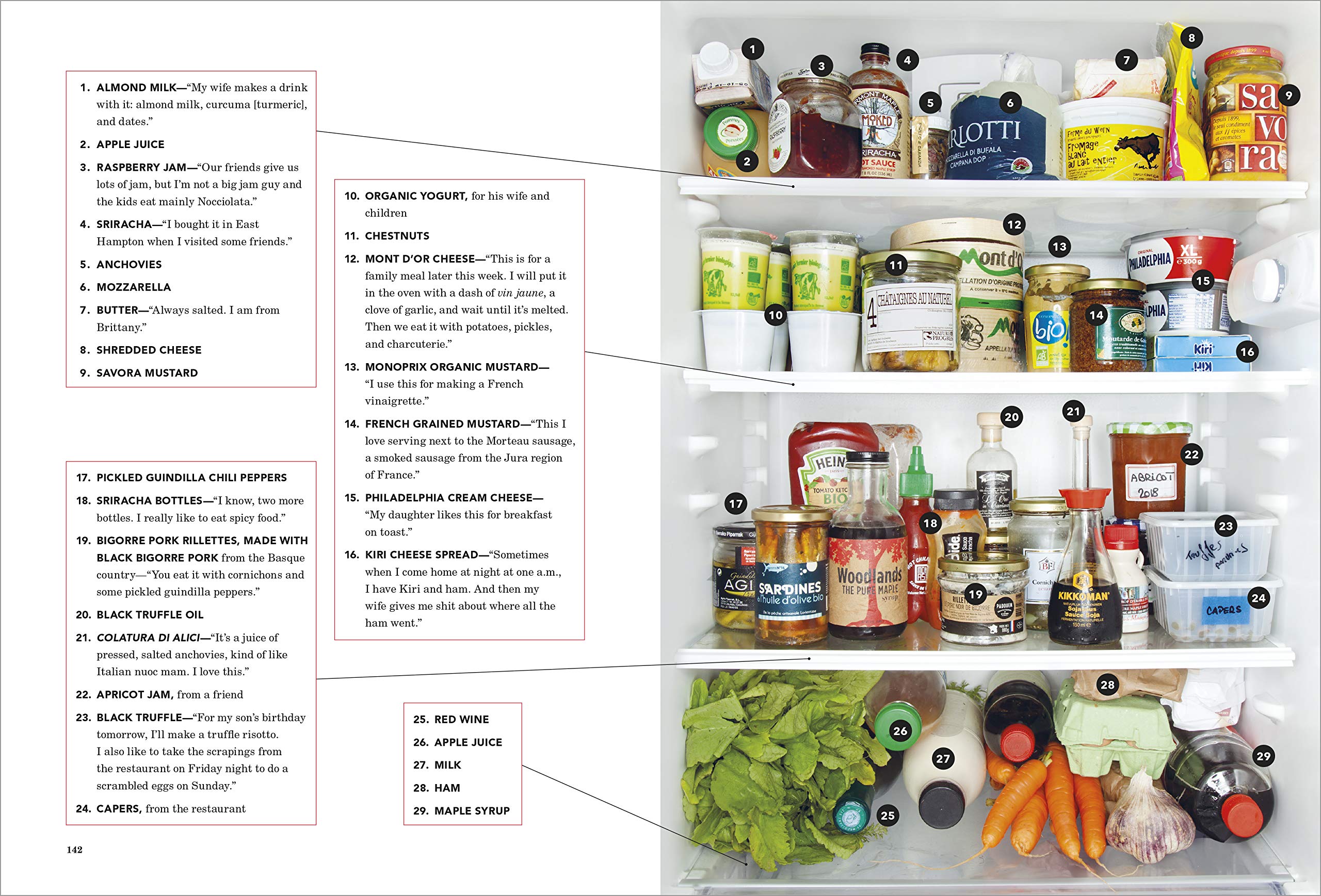 Each chef’s entry contains an anecdotal essay that sheds light on his or her personal and culinary background; numerous annotated full-bleed spreads of the contents of their refrigerators and freezers so you can see what makes their culinary clock tick; a short, straightforward Q&A section; an informal portrait in their kitchen; and recipes.