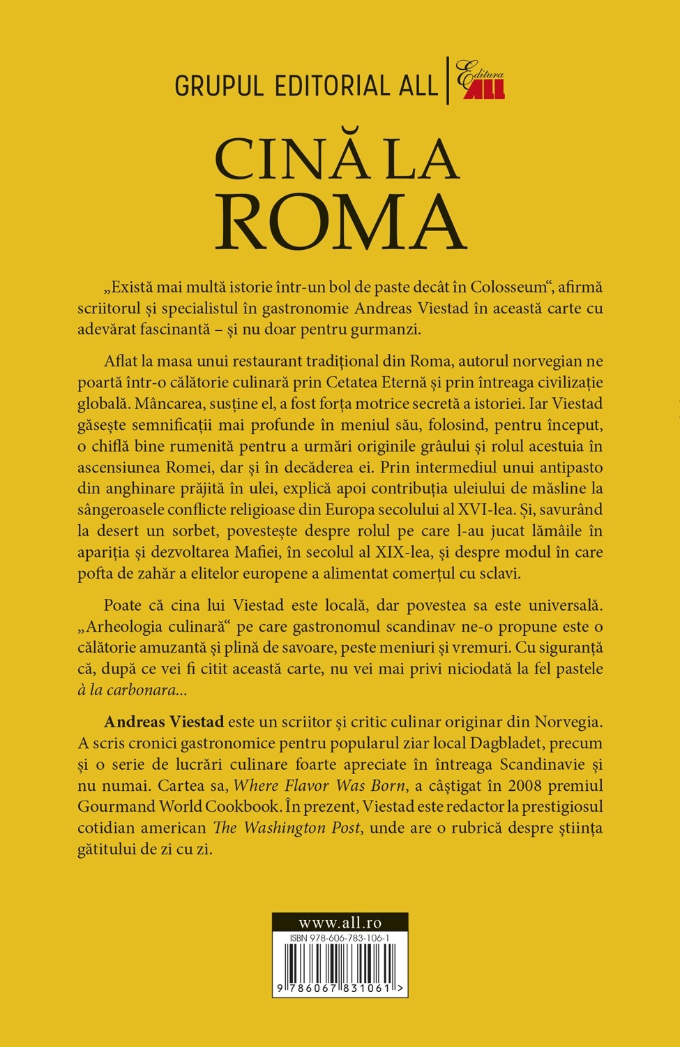 Andreas Viestad, un renumit critic de restaurante și un reputat specialist scandinav în gastronomie, ne serveşte, pagină cu pagină, un regal culinar şi istoric. O masă în Cetatea Eternă se transformă într-un pretext pentru a explora în tandem istoria omenirii și a bucătăriei antice, medievale și moderne. Cină la Roma nu li se adresează numai gurmanzilor; este lectura ideală pentru pofticioşii dornici să descopere atât gustul lumii în care trăim, cât şi savoarea trecutului.