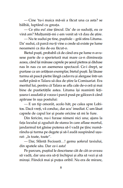 Dacă te faci polițist, trebuie să ai inimă de piatră, își dă cu părerea cineva. Dar jandarmul Lituma își pierde cumpătul când vede cu câtă bestialitate a fost ucis tânărul Palomino Molero, din trupele de aviație. Cât despre locotenentul Silva, șeful lui, el e topit după doña Adriana, trupeșa patroană a unui modest birt. Și, ca și cum toate acestea nu ar fi de ajuns, ancheta conduce spre „peștii cei mai mari“, ofițerii de la Baza aeriană, care încearcă să mușamalizeze totul.