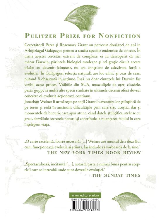 Jonathan Weiner îi urmărește pe soții Grant în aventura lor științifică de pe teren și redă în amănunt dificultățile prin care trec aceștia, dar și momentele de bucurie care apar atunci când datele științifice, strânse cu greu, dezvăluie secretele naturii și contribuie la nuanțarea felului în care înțelegem viața.