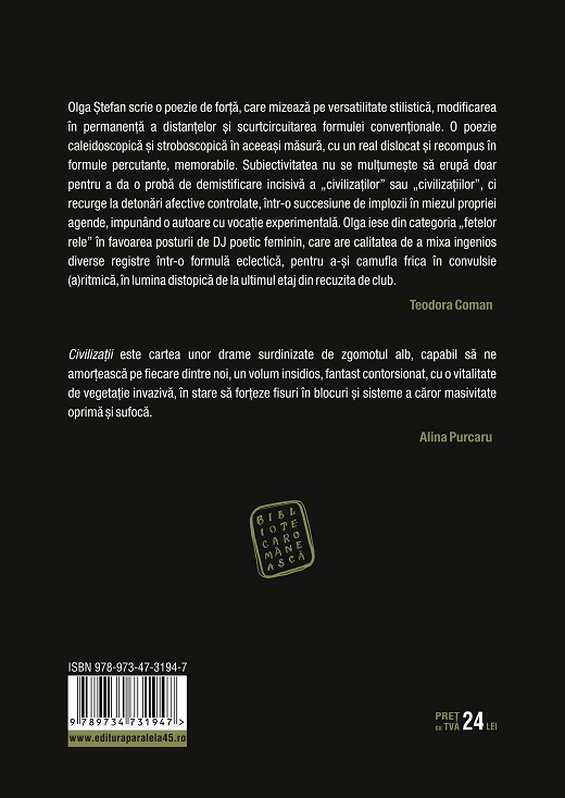 Civilizații este cartea unor drame surdinizate de zgomotul alb, capabil să ne amorțească pe fiecare dintre noi, un volum insidios, fantast contorsionat, cu o vitalitate de vegetație invazivă, în stare să forțeze fisuri în blocuri și sisteme a căror masivitate oprimă și sufocă.