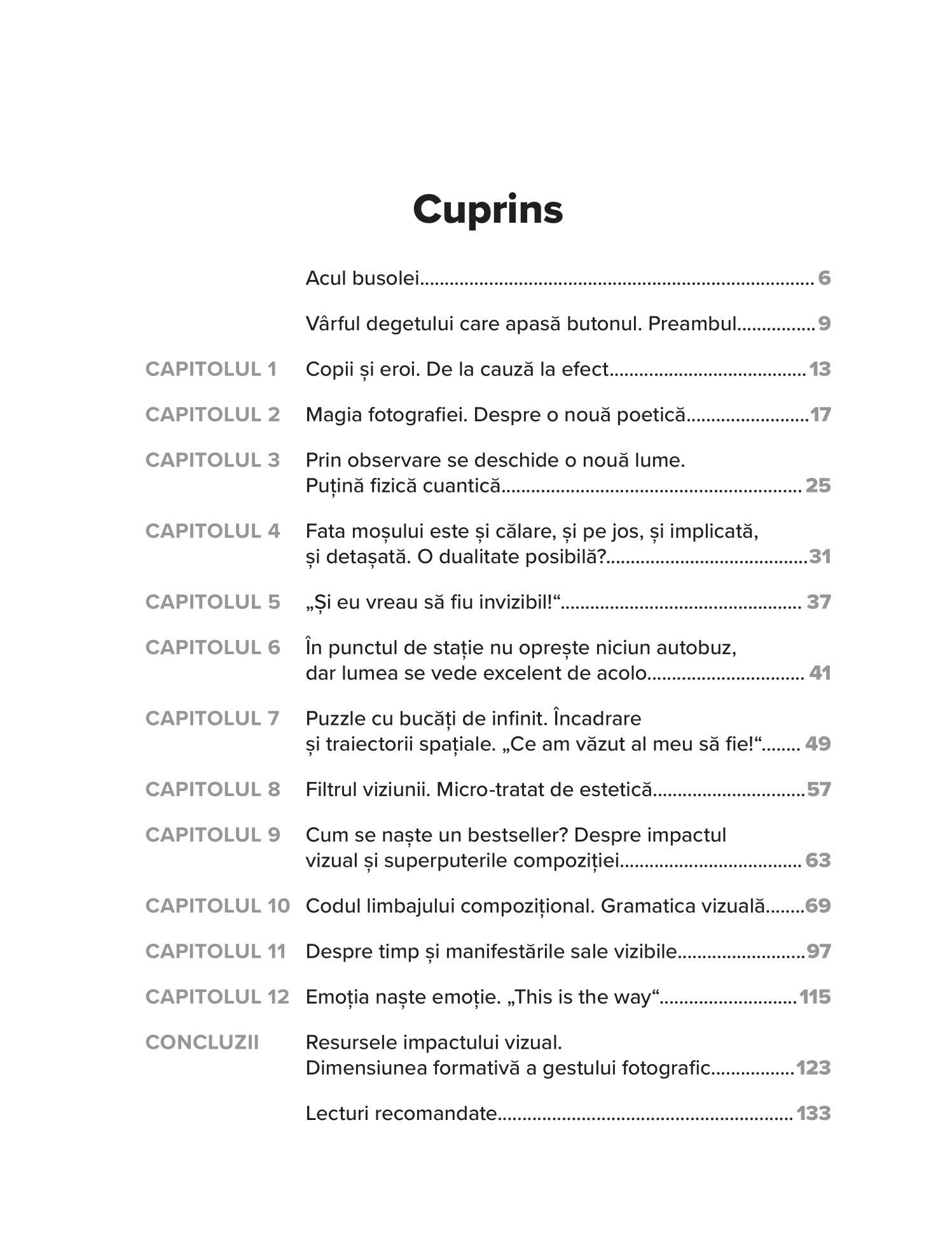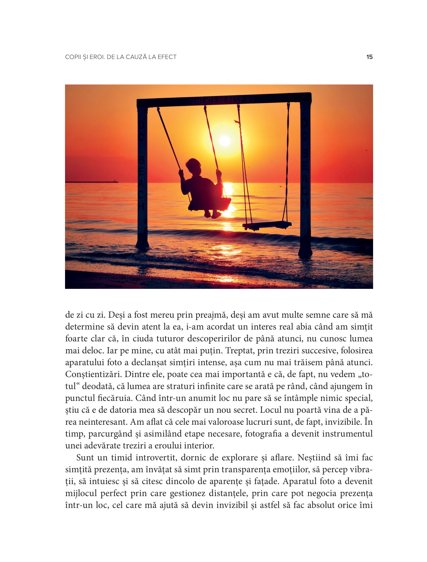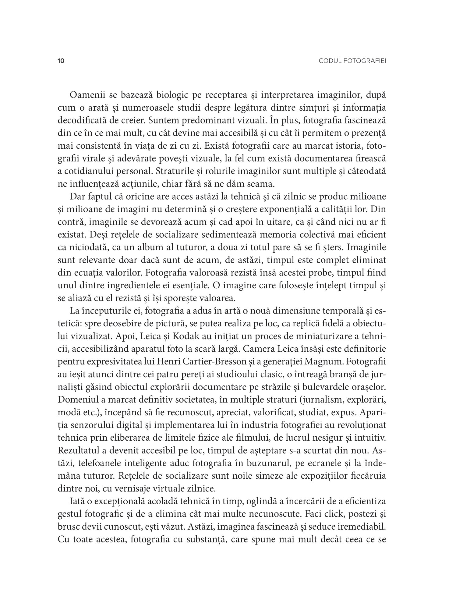 Dincolo de aura glam a fotografiei, dincolo de numărul de like-uri primite pe rețelele de socializare și de viralitatea online, dincolo de tehnică și de setările așa-zis câștigătoare ale unui aparat performant se ascund adevăratele premise ale elaborării unei imagini reușite: curiozitatea, prezența, atenția la tot ce se află în jur și o secvență irepetabilă spațiu–timp–lumină–emoție, care îl deschide pe observatorul-fotograf spre straturi invizibile ale lumii, nerăbdătoare să fie aduse în prim-plan.