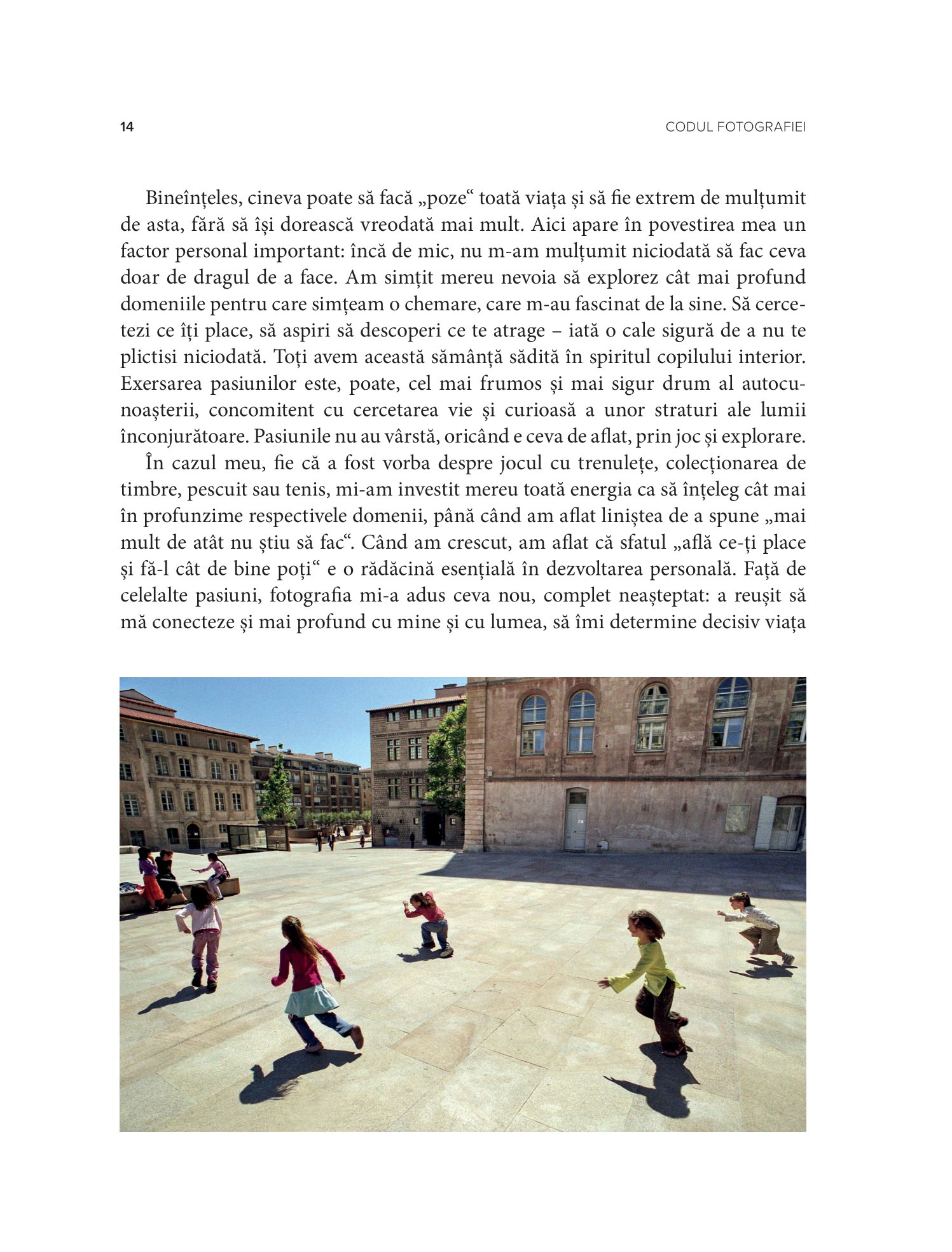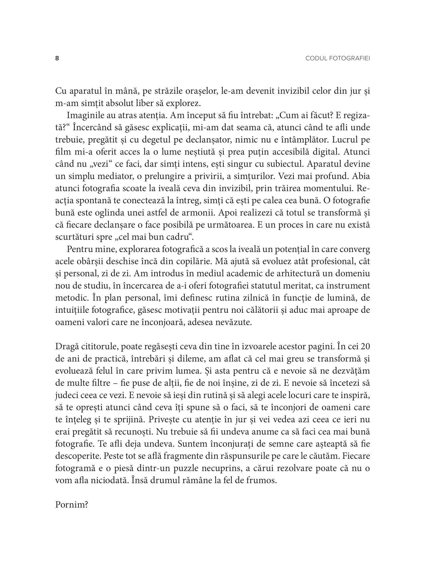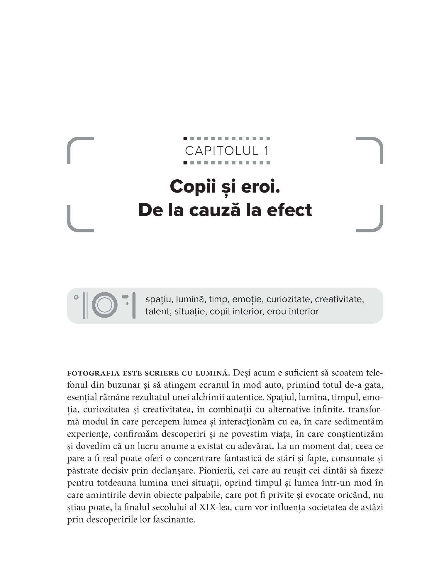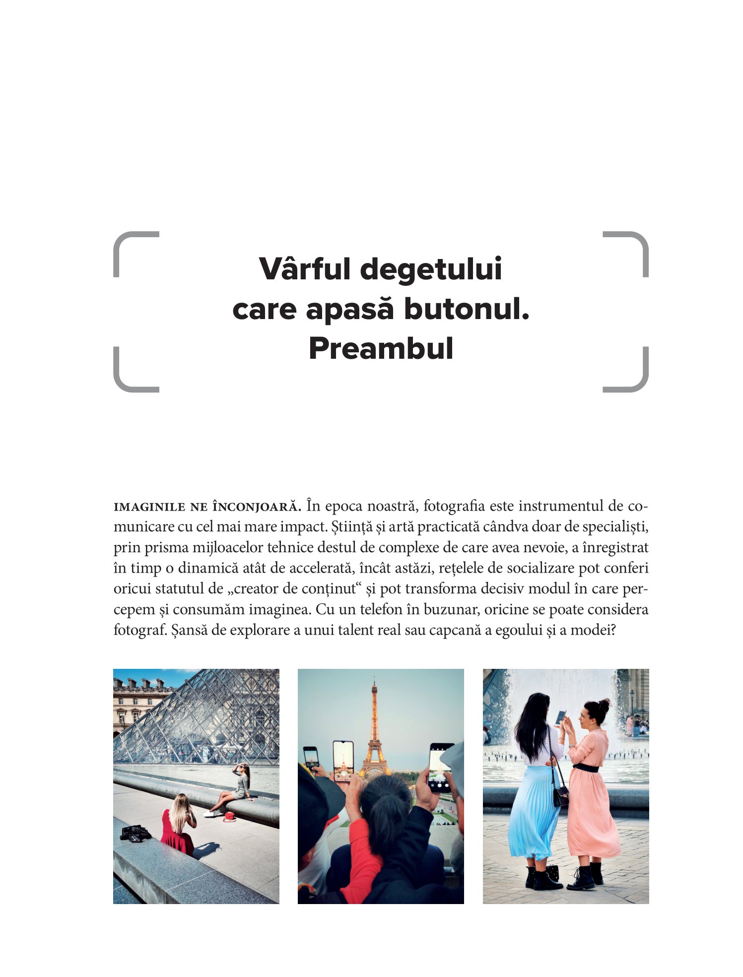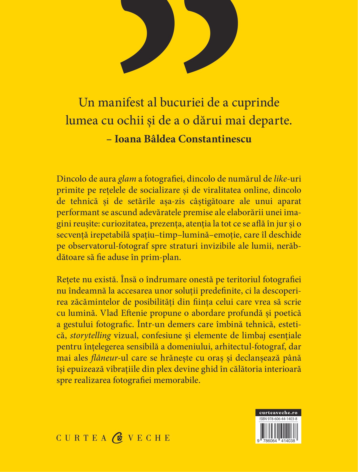 Rețete nu există. Însă o îndrumare onestă pe teritoriul fotografiei nu îndeamnă la accesarea unor soluții predefinite, ci la descoperirea zăcămintelor de posibilități din ființa celui care vrea să scrie cu lumină. Vlad Eftenie propune o abordare profundă și poetică a gestului fotografic. Într-un demers care îmbină tehnică, estetică, storytelling vizual, confesiune și elemente de limbaj esențiale pentru înțelegerea sensibilă a domeniului, arhitectul-fotograf, dar mai ales flâneur-ul care se hrănește cu oraș și declanșează până își epuizează vibrațiile din plex devine ghid în călătoria interioară spre realizarea fotografiei memorabile.