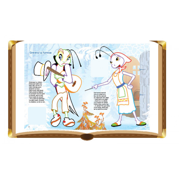 În paginile acestei cărți copiii pot colora personajele și în același timp, pot învăța lucruri folositoare din morala fabulelor: Racul, broasca și știuca • Greierul și furnica • Vulpea și bursucul • Porumbelul și furnica • Vulpea în livadă • Leul și șoricelul • Corbul și vulpea • Doi câini.