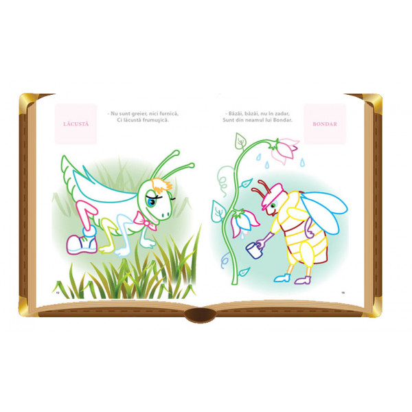 Liniile de contur indică în ce nuantă poate fi colorat fiecare element, fiecare desen fiind însoțit de denumirea gândăcelului și de o scurtă poezie amunzantă. În paginile acestei cărți de colorat copiii fac cunoștință cu gândăcei simpatici și jucăuși: albina, buburuza, libelula, cărăbuș, furnica, greieraș, omida, fluture, păianjen, licurici, musca, lăcusta, bondar și altii.