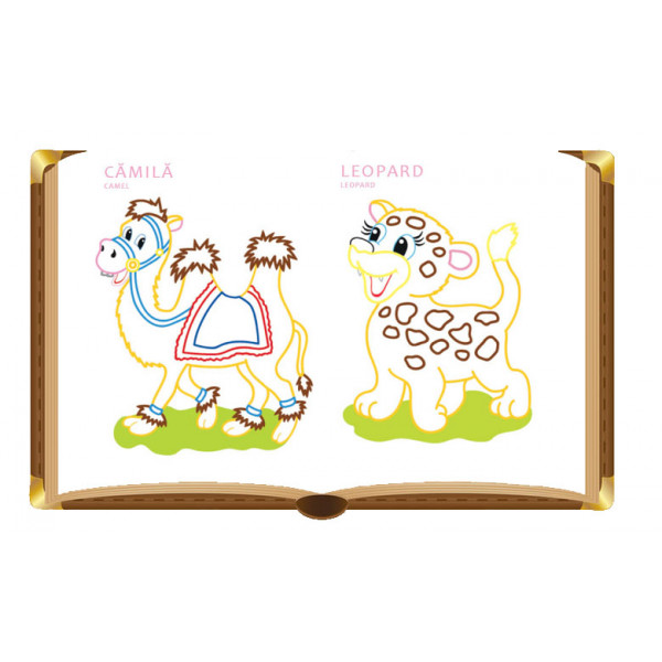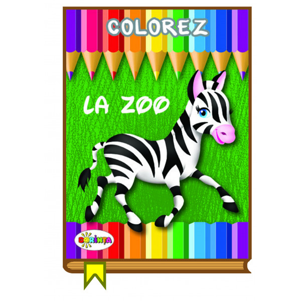 Liniile de contur indica în ce nuanță poate fi colorat fiecare element, fiecare desen fiind însoțit de denumirea în limba română și engleză. În paginile acestei cărți de colorat copiii învață cum arată și cum se numesc animalele de la Zoo: girafa, tigru, elefant, rinocer, maimuța, zebra, leu, șarpe, crocodil, urs, cangur, leopard, cămila, koala și alte animale.