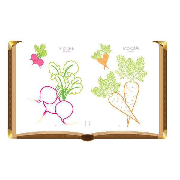 În paginile acestei cărți de colorat copiii învață cum arată și cum se numesc legumele preferate: vânăta, sfecla roșie, varză, ardei iute și gras, morcov, ridiche, castravete, cartof, ceapa, usturoi, dovlecei, roșii, dovleac, pepene, conopidă.