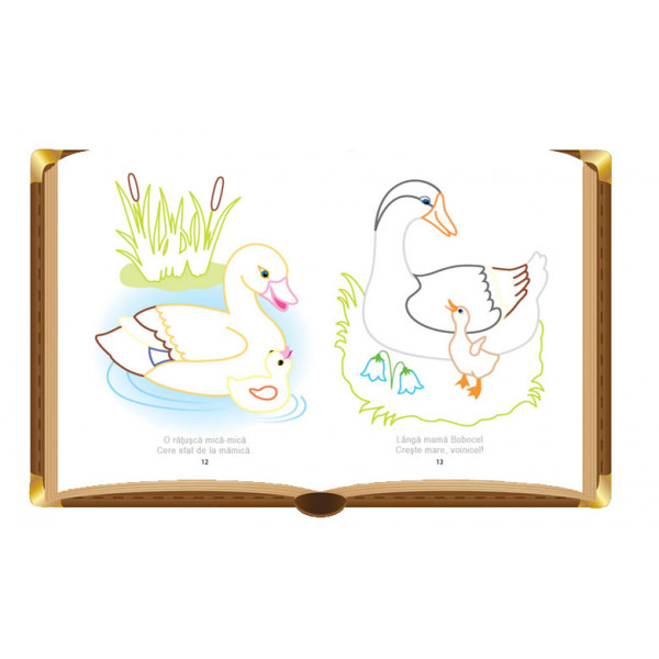 Liniile de contur indică în ce nuanță poate fi colorat fiecare element, fiecare desen fiind însoțit de o scurtă poezie amuzantă. În paginile acestei cărți de colorat copiii fac cunoștință cu animalele și puii lor: iepure, pisica, leu, câine, pește, găina, vulpe, rândunică, cangur, rață, gâscă, delfin, elefant și alte animale.