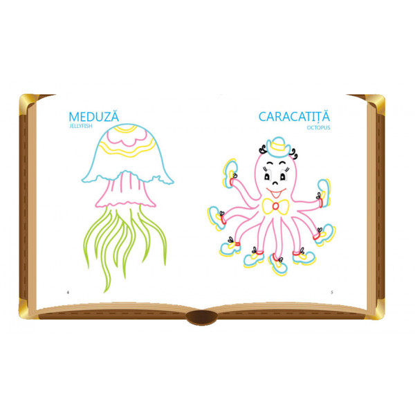 În paginile acestei cărți de colorat copiii află cum arată și cum se numesc diferite viețuitoare acvatice: delfin, caluț de mare, caracatița, meduză, rac, broasca țestoasă, rechin, balena, steluța de mare, scoici, pisica de mare, broasca și alte animale marine.