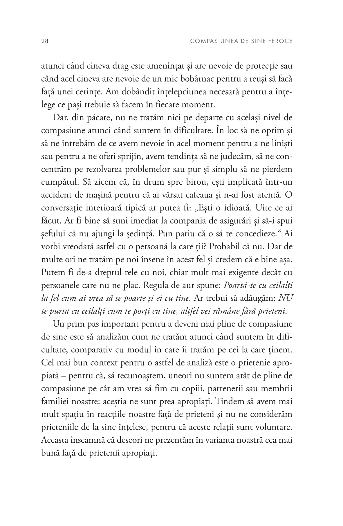 Uneori, ai nevoie să fii tandră cu tine însăți, să te accepți cu toate imperfecțiunile tale omenești, să te iubești și să trăiești clipa. Alteori, trebuie să acționezi, să trasezi limite, să rămâi pe poziții, să spui nu: compasiunea de sine poate să fie și tandră, și feroce.
