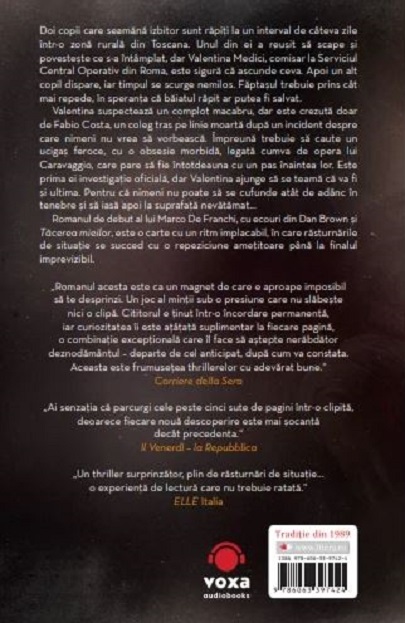 Romanul de debut al lui Marco De Franchi, cu ecouri din Dan Brown și Tăcerea mieilor, este o carte cu un ritm implacabil, în care răsturnările de situație se succed cu o repeziciune amețitoare până la finalul imprevizibil.