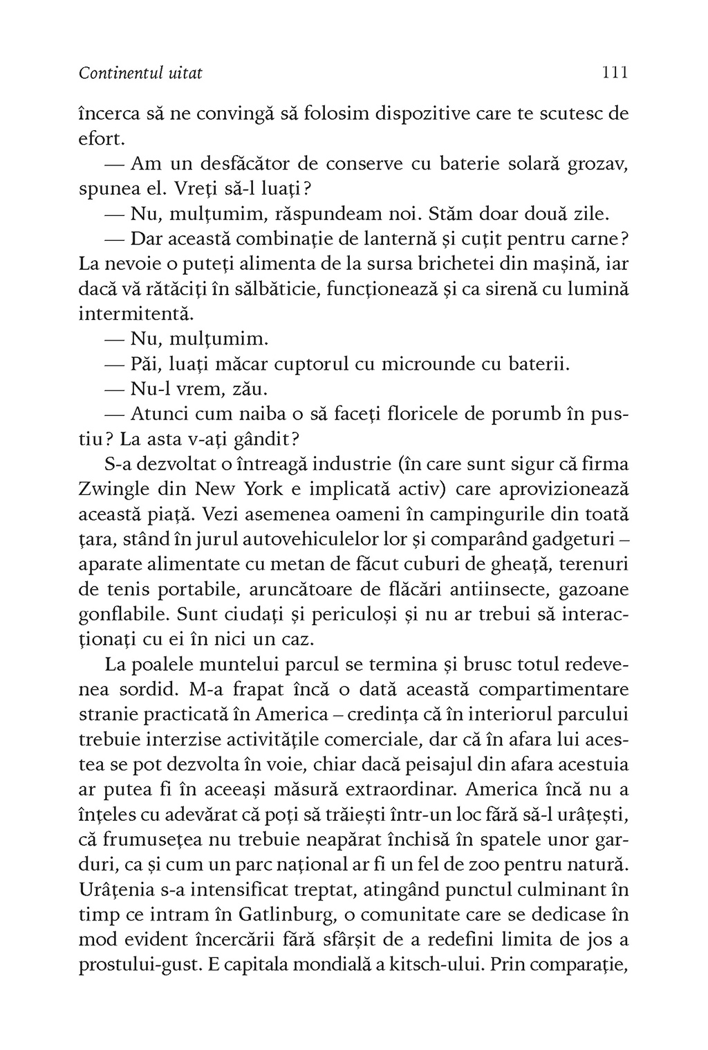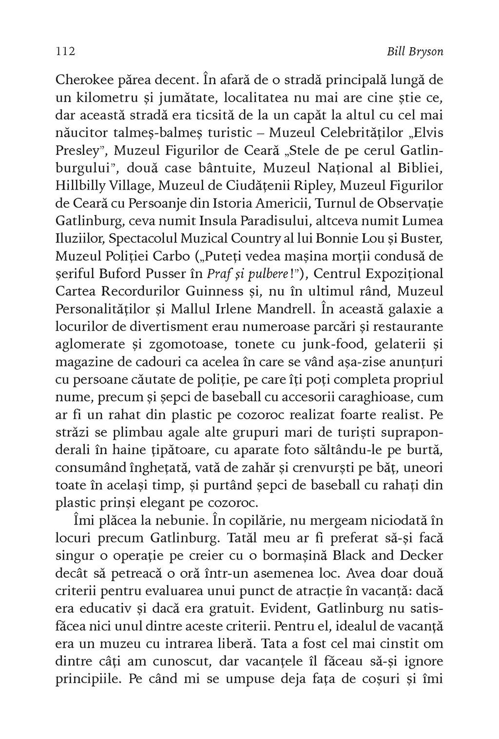 După ce a petrecut zece ani în Anglia, Bill Bryson vrea să-şi rememoreze copilăria, aşa că pleacă din locul în care s-a născut, Des Moines, Iowa, într-o călătorie prin 38 dintre statele americane, pe care o documentează cu mult umor. Autorul speră să se reîntîlnească cu peisajele idilice ale copilăriei sale, însă găseşte lanuri nesfîrşite de porumb, benzinării, moteluri şi localuri care arată peste tot aproape la fel şi sunt populate de oameni care seamănă uimitor de mult unul cu altul. Un jurnal de călătorie despre o lume mai puţin cunoscută, un amestec imprevizibil de kitsch şi frumuseţe, cartea lui Bill Bryson combină descrieri ale vieţii din micile oraşe în care ajunge autorul cu povestiri despre tinereţea lui şi despre America şi americani, toate însoţite de comentariile lui sarcastice inegalabile.