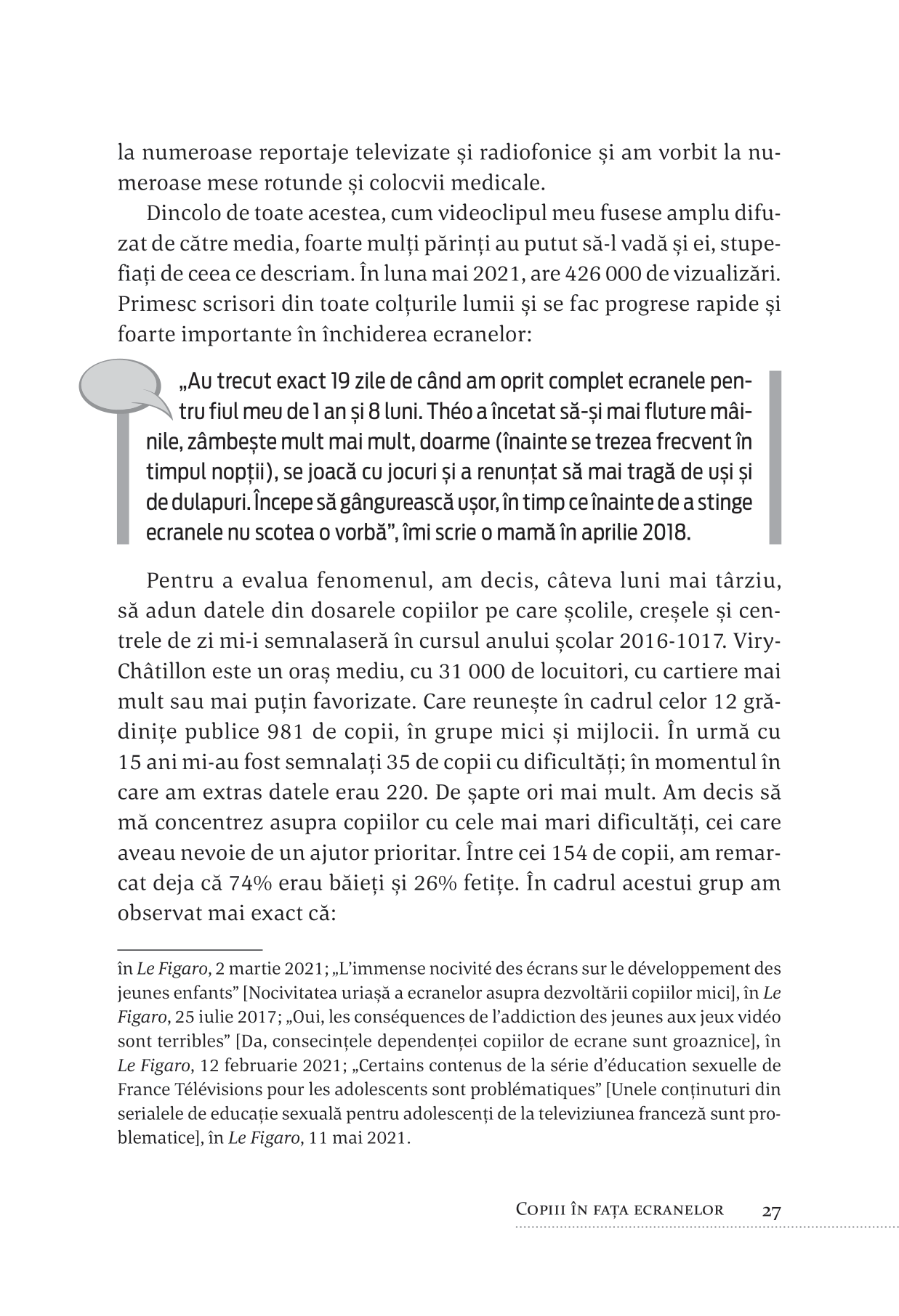 „Celor fascinați de tehnologie li s-a părut amuzantă reclama cu fetița care încerca să dea paginile unei cărți cu degetul, așa cum se face pe tabletă, și care era contrariată de faptul că o carte nu funcționa pe principiul pe care ea îl cunoștea. Pe mine, personal, m-a îngrozit! Este periculos să creștem copii care nu știu că pisicuța pe care o hrănesc cu lapte virtual în aplicația de pe telefon are blana moale, pufoasă și plăcută la atingere.” CRISTINA PETRESCU - GHENEA, medic specialist în psihiatria copilului și adolescentului, psihoterapeut.