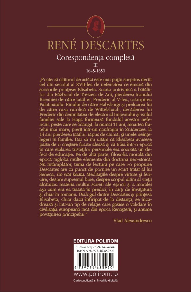 René Descartes (1596-1650), filosof și matematician francez, unul dintre întemeietorii filosofiei moderne. Principalele lucrări: Discurs asupra metodei (1637), Meditații metafizice (1641), Principiile filosofiei (1644), Pasiunile sufletului (1649). La Editura Polirom au mai apărut: Corespondența completă. Volumul I: 1607-1638 (2014) și Corespondența completă. Volumul al II-lea: 1639-1644 (2015).