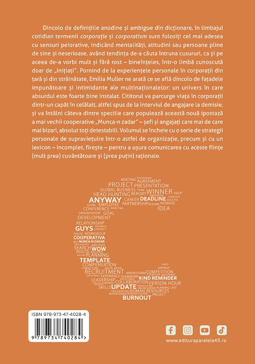 Pornind de la experiențele personale în corporații din țară și din străinătate, Emilia Muller ne arată ce se află dincolo de fațadele impunătoare și intimidante ale multinaționalelor: un univers în care absurdul este foarte bine instalat. Cititorul va parcurge viața în corporații dintr-un capăt în celălalt, altfel spus de la interviul de angajare la demisie, și va întâlni câteva dintre speciile care populează această nouă ipostază a mai vechii cooperative „Munca-n zadar” – șefi și angajați care mai de care mai bizari, absolut toți detestabili.