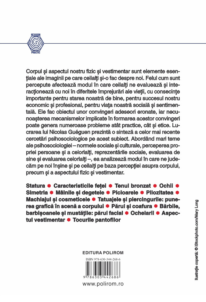 Lucrarea lui Nicolas Guéguen prezintă o sinteză a celor mai recente cercetări psihosociologice pe acest subiect. Abordând mari teme ale psihosociologiei – normele sociale și culturale, perceperea propriei persoane și a celorlalți, reprezentările sociale, evaluarea de sine și evaluarea celorlalți –, ea analizează modul în care ne judecăm pe noi înșine și pe ceilalți pe baza percepției asupra corpului, precum și a aspectului fizic și vestimentar.