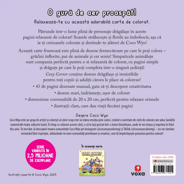 Cozy Corner conține desene drăgălașe și irezistibile pentru toți copiii și adulții cărora le place să coloreze!